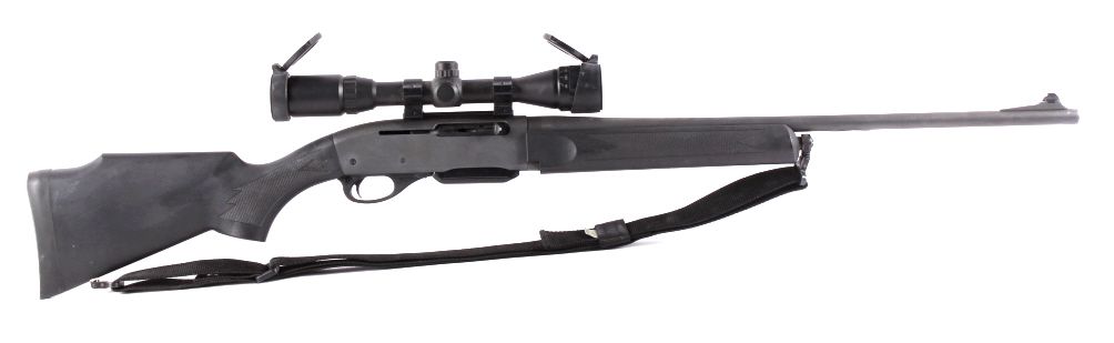 This is a Remington Model 7400 auto loading rifle with Leapers 3-9x32 AO Scope. The rifle is in a .30-06 SPRG caliber showing a black tactical stock and frame. The rifle shows overall good condition with a few small scratches on top section of barrel. Serial number C8032020. Comes with extra clip.