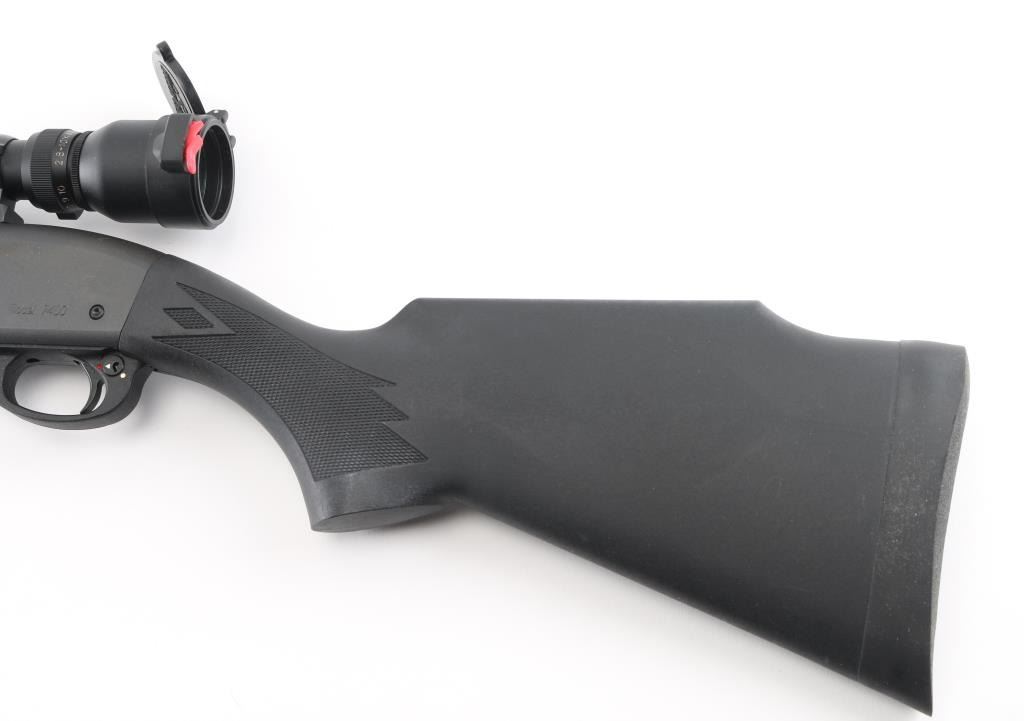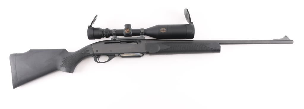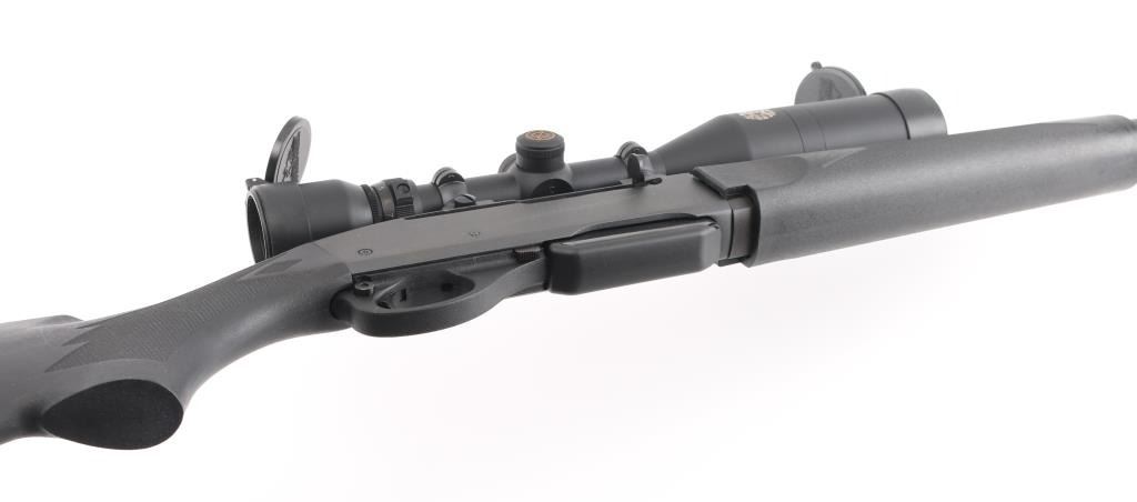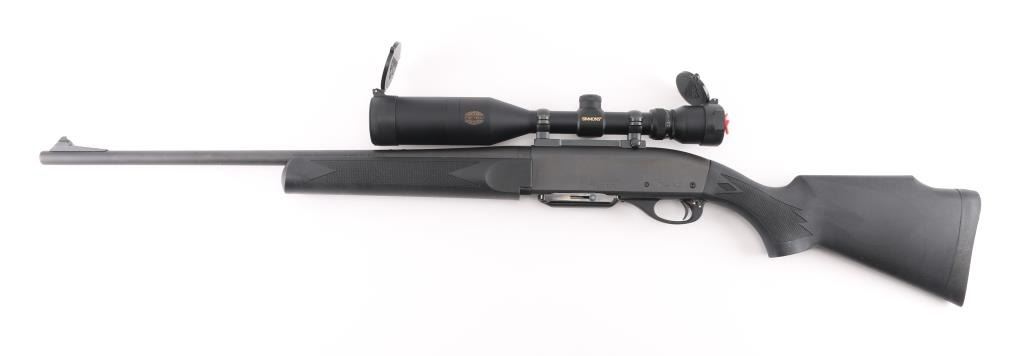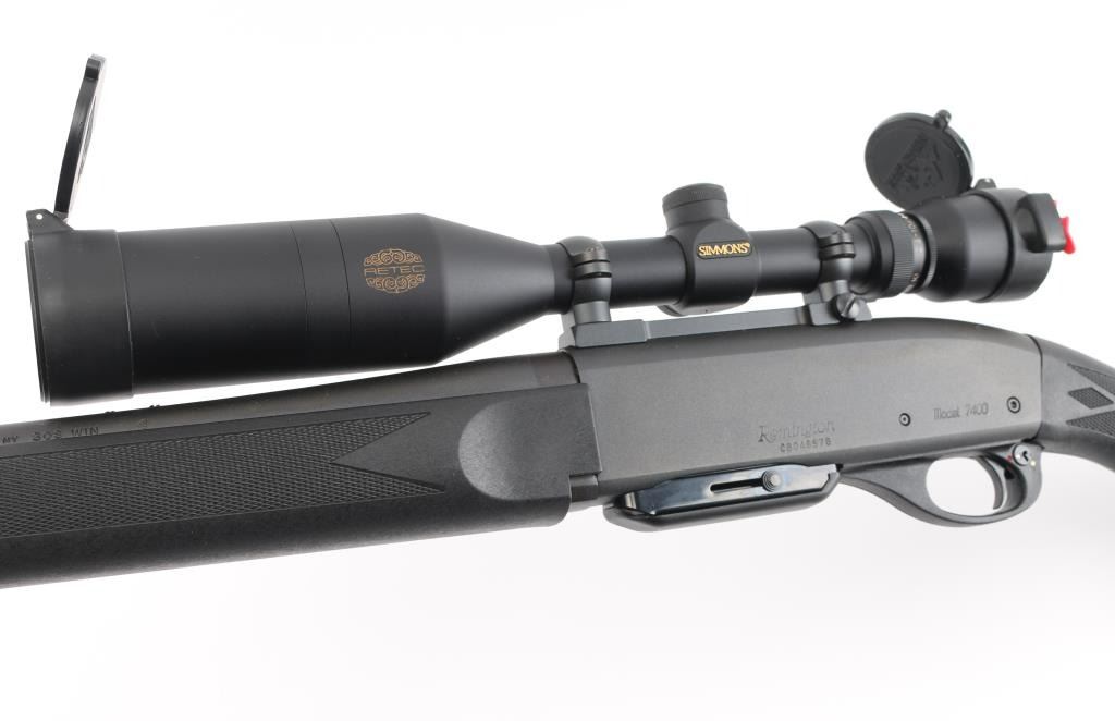 Semiautomatic sporting rifle features approx 22 inch barrel, detachable magazine, blade front sight, rear sight removed, one piece Leupold base & rings attached to receiver, push button safety (can be rotated to lock in 'safe' position). Two piece black polymer stock has checkered forend & wrist, black rubber recoil pad. Bore is excellent. Retains 98% matte blue with few scratches. Stock is very good condition with handling marks. Includes (1) magazine. Mounts a very good condition Simmons "RETEC" 2.8-10x44mm scope with duplex reticle, clear view, flip up caps. Condition is NRA Excellent *** Modern Firearm ***