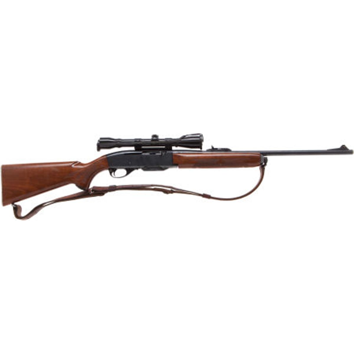 Remington Model 742 Woodsman Semi-Automatic Rifle. Serial no. 265496, .308 caliber, 22-inch barrel with ramp post front and adjustable rear sights. Blued finish. Mounted with Bausch & Lomb telescopic sight. Varnished walnut stocks with checkered forearm and pistolgrip. Black plastic grip cap and steel buttplate. Sling swivels and brown leather sling. Condition: Good to very good retaining approximately 90-95% original blue finish. Scattered light handling wear. Mirror bright bore. NRA FIREARMS FOR FREEDOM PROGRAM