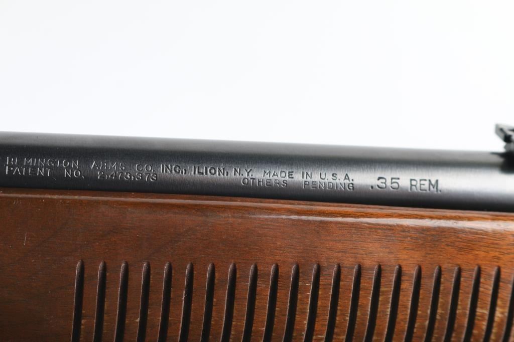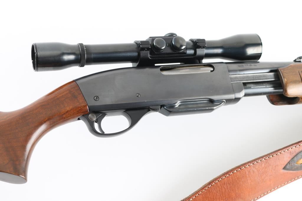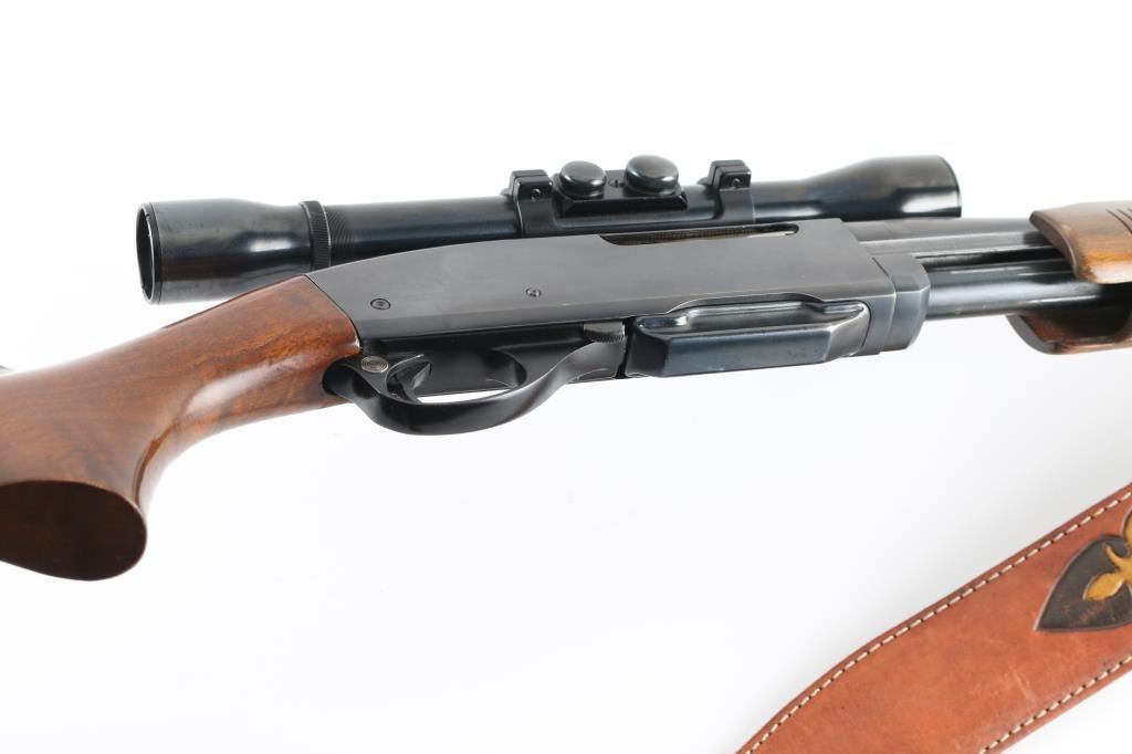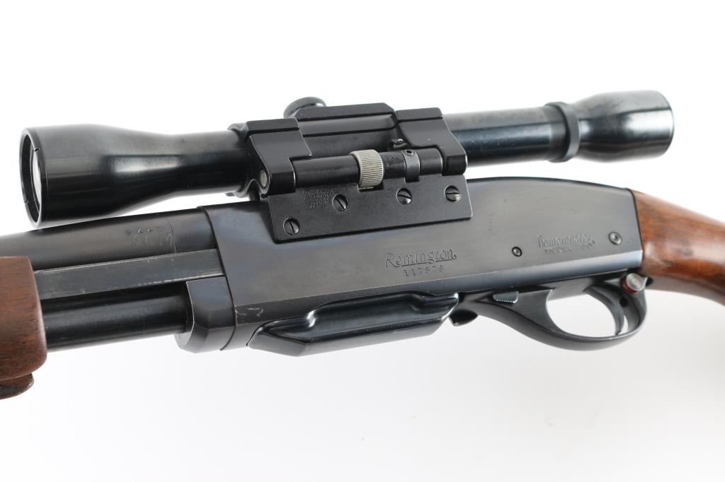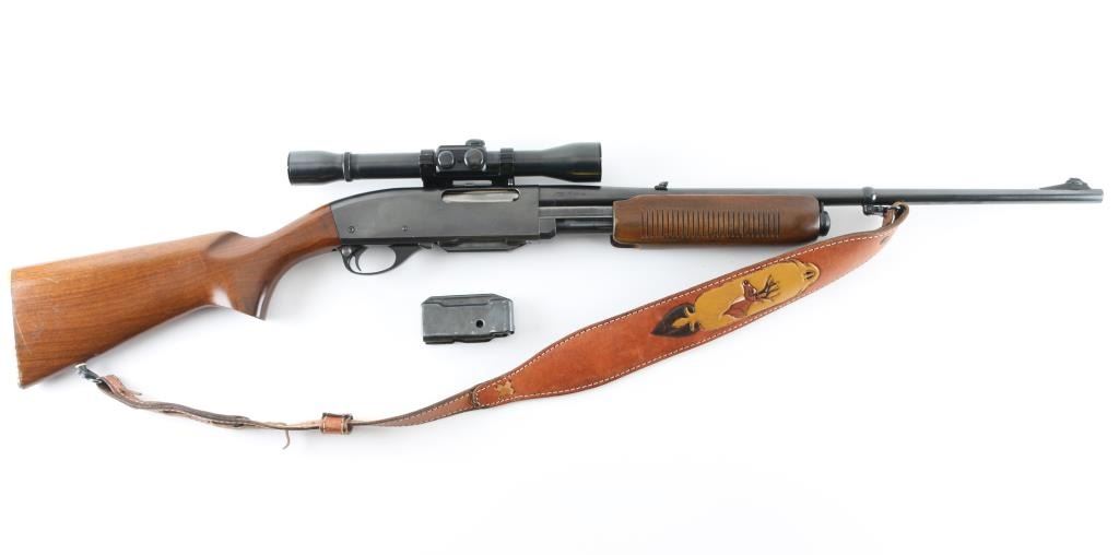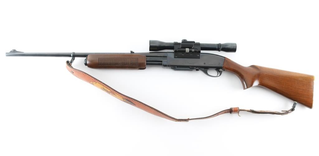 'Gamemaster' (1952-1981) Pump action rifle features blued finish, grooved wood pump handle, smooth wood stock with curved grip, serrated steel buttplate, 22.5" barrel, post/bead front sight, adjustable, flip. u-notch rear sight, detachable box magazine, manual safety., has bolt stop feature to keep action open when magazine is empty. Bore is excellent/bright. Retains 90% blue, with minor edge/handling wear. Someone has etched "OLM" on the left lower barrel in small letters. Wood is very good condition with minor scratches, some finish losses. Mounts a very good condition Weaver KV scope with fine crosshair, good view. Side mounted with a Pachmayr base/rings that can flip down to allow you to shoot with open sights, can be locked into place. Nice feature. Comes with two magazines. NRA Condition-Very Good. Modern Firearm.