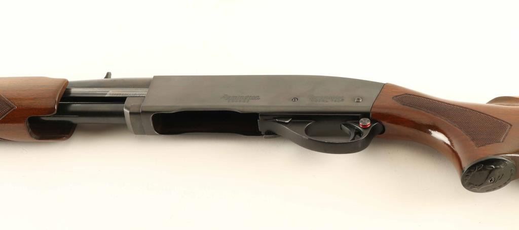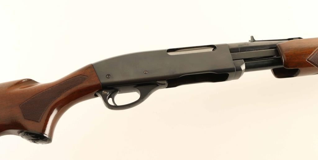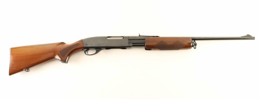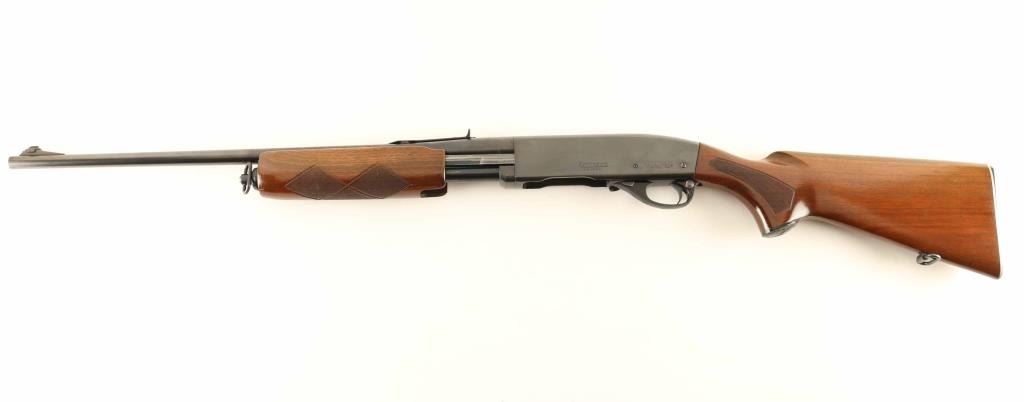 'Five Diamond' Vintage American made magazine fed slide-action sporting rifle chambered in .35 Remington, manufactured circa 1954. Features a blued finish, 22" tapered barrel, ramped blade front sight with bead top, adjustable rear sporting sight, factory drilled & tapped receiver, smooth trigger, push button safety, no magazine, sling swivels, hand checkered walnut slide handle and pistol grip shoulder stock with grip cap & factory serrated metal buttplate. Rifle exhibits approximately 95% of it's original finish showing slide wear on the action tube & bars, some scattered light scratches and scuffs on the alloy triggerguard. Action is smooth, the bore is pristine, and the wood stocks are near fine with few blemishes. Condition is near NRA Excellent. ***Modern Firearm***