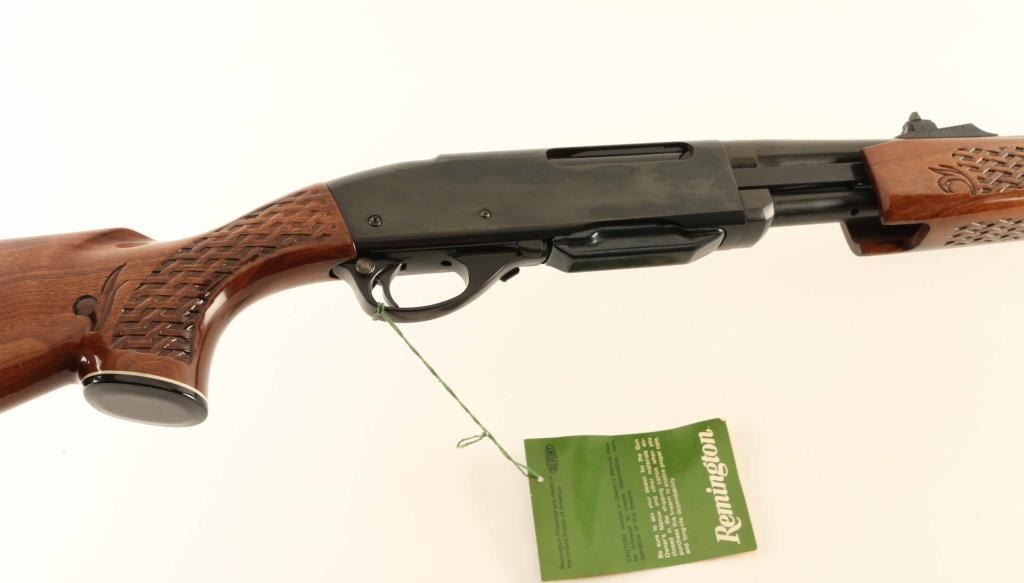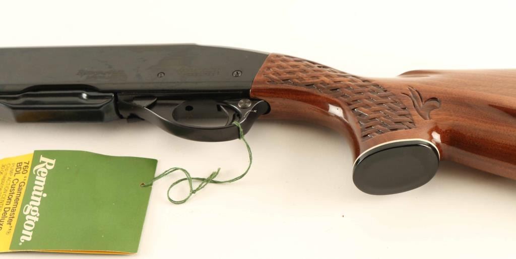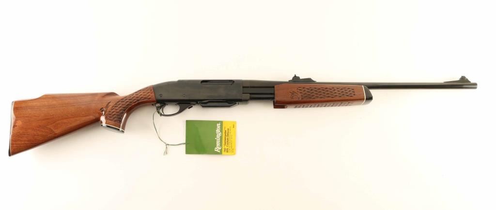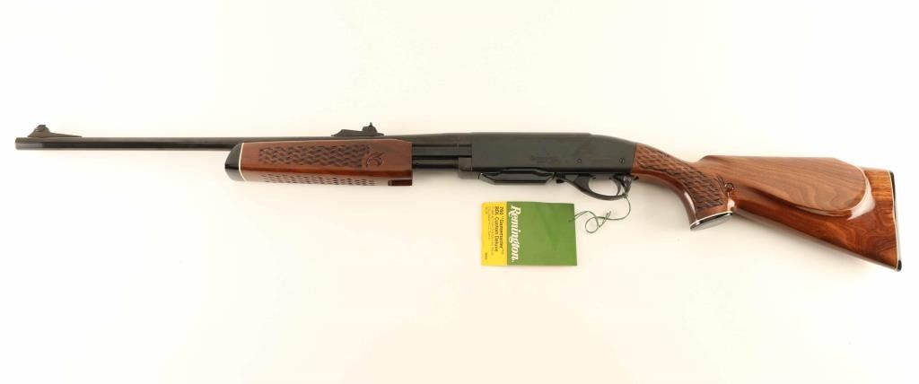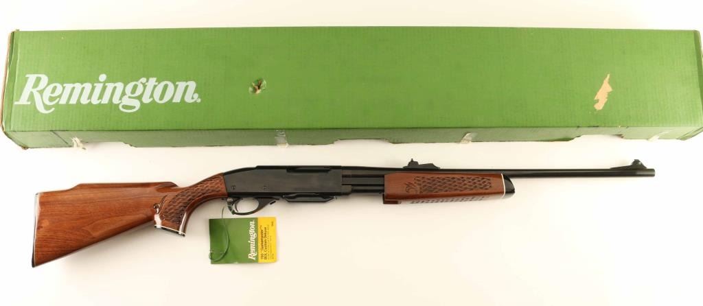 'Custom Deluxe' American made magazine fed slide-action sporting rifle chambered in .30-06 Springfield, manufactured circa 1980(last year production). Features a blued finish, 22" tapered barrel, ramped blade front sight with bead top, sliding adjustable rear sight, factory drilled & tapped receiver, smooth trigger with beveled edges, push button safety, detachable 4 round magazine, basket weave checkered walnut slide handle with black forend cap & high gloss finish, and pistol grip shoulder stock with black grip cap, right handed cheek rest & factory buttplate. Includes the original factory cardboard box with hang tag and documents. Rifle exhibits approximately 99% of it's original blued finish with only light slide wear on the action tube observed. Action is smooth, the bore is pristine, and wood stocks are fine Condition is like NRA Perfect in box. ***Modern Firearm***
