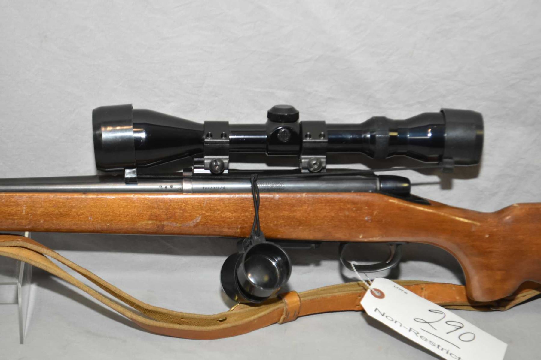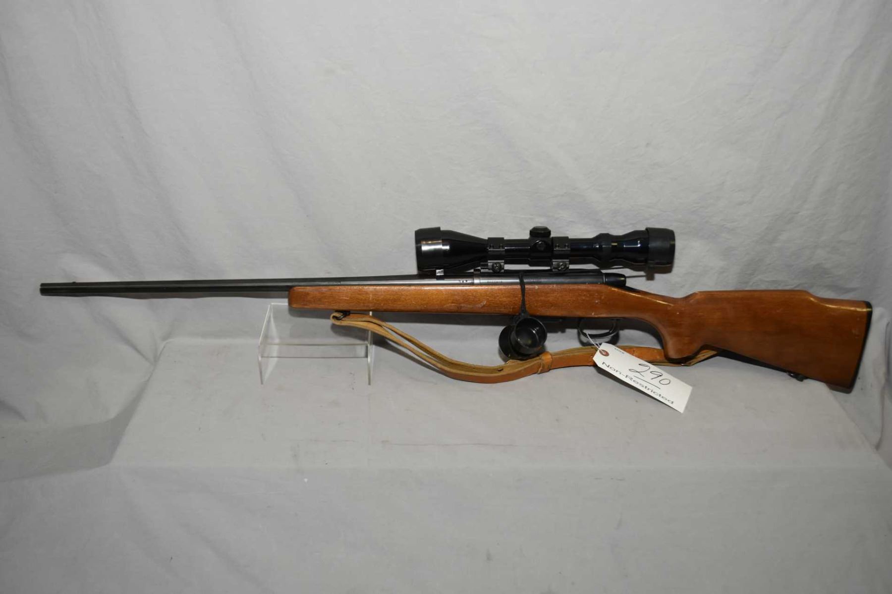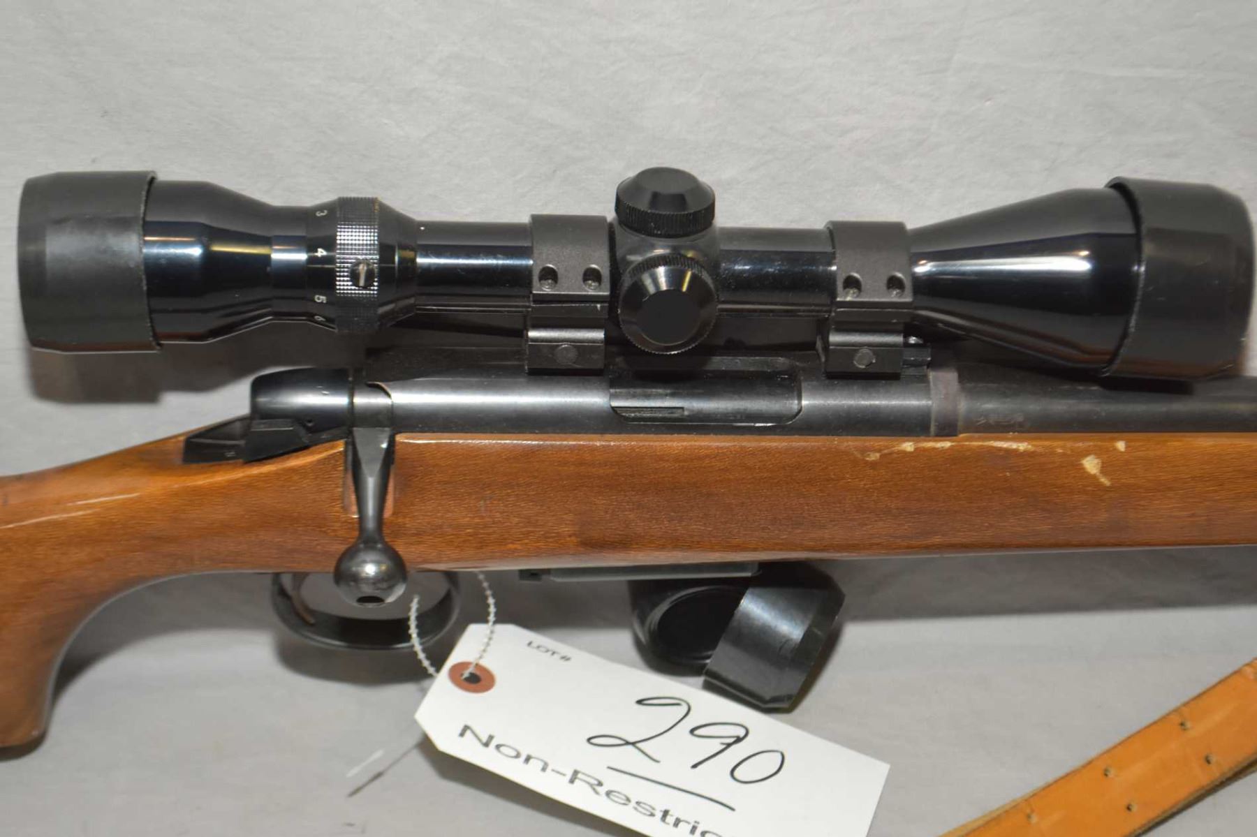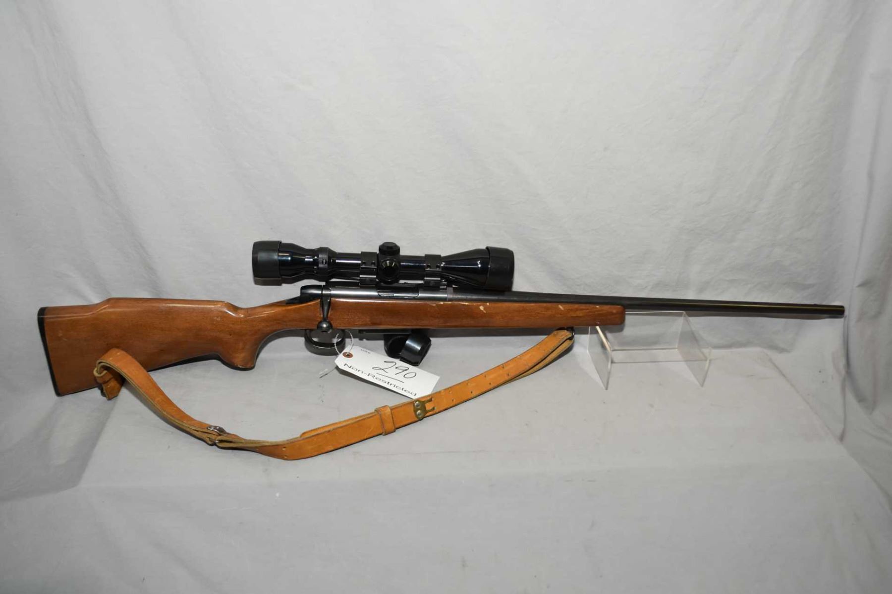 Remington Model 788 .222 Rem Cal Mag Fed Bolt Action Rifle w/ 24" bbl [ blued finish, few marks, no sights, but fitted w/ World Class Plus 3 x 9 x 44 Scope with rings & bases, two sets of caps to match scope ends, heavy leather sling, some marks to plain pistol grip stock, Remington butt plate ] Ser # 6077974