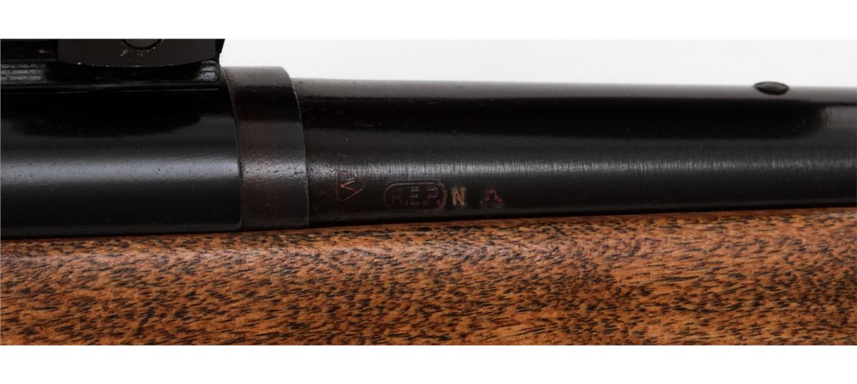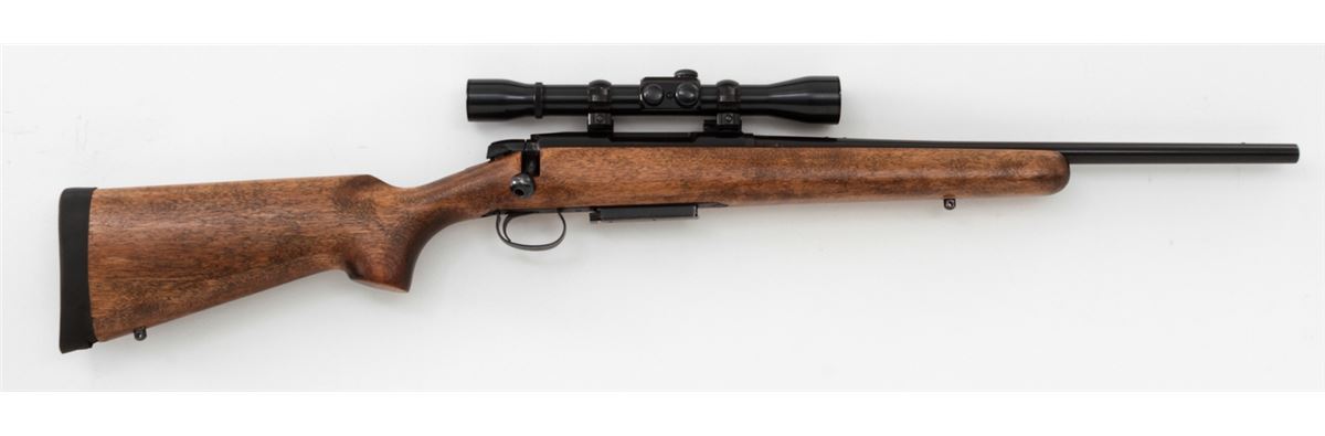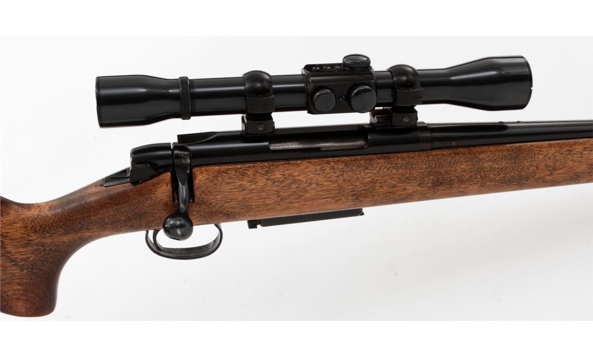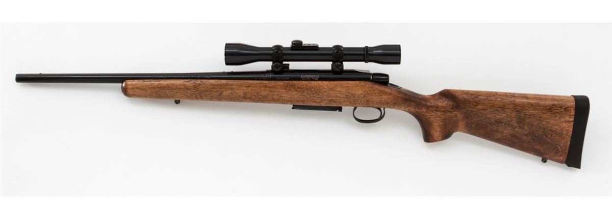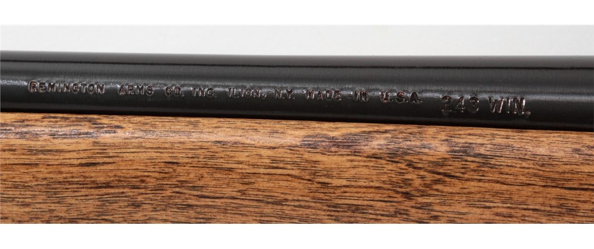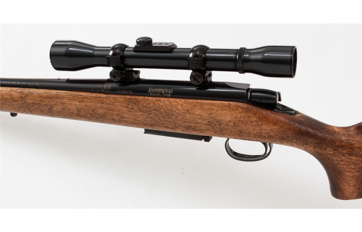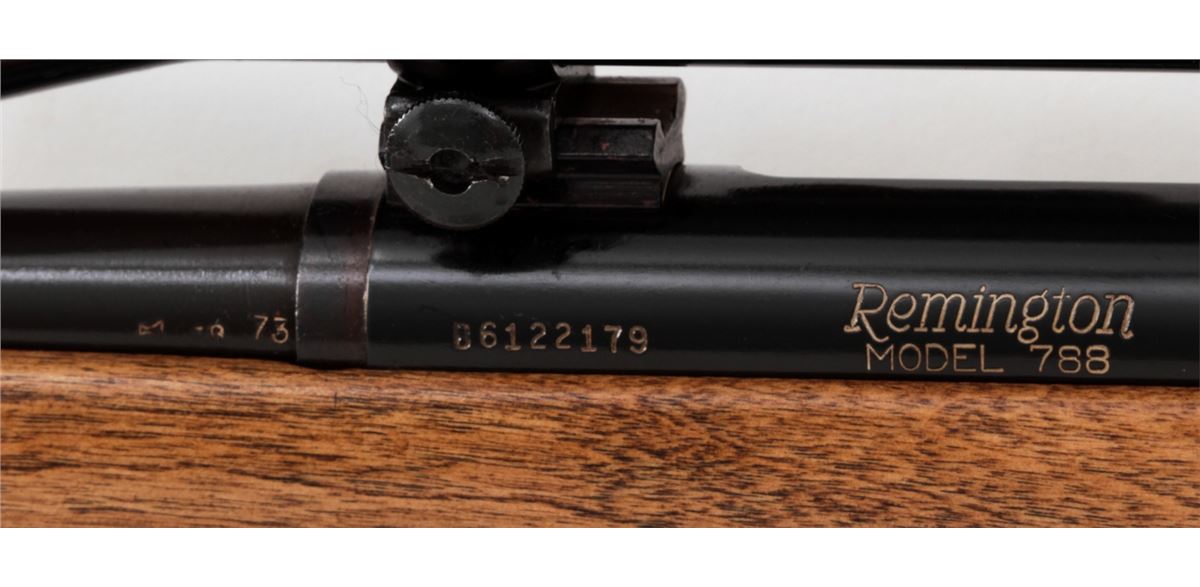 Remington Model 788 Bolt Action Rifle, #B6122179, .243 cal., 18'' barrel, blue finish, birch stock, and Weaver KV scope, complete with one magazine. Condition is very good retaining approx. 97% blue with some thinning to painted finish of triggerguard and floorplate area. Loss at toe of rubber butt pad. Crisp action, good scope optics, mirror bright bore. Est.: $250-$450. (Modern)
