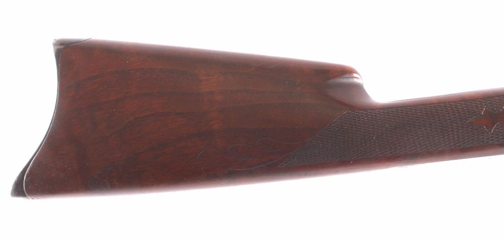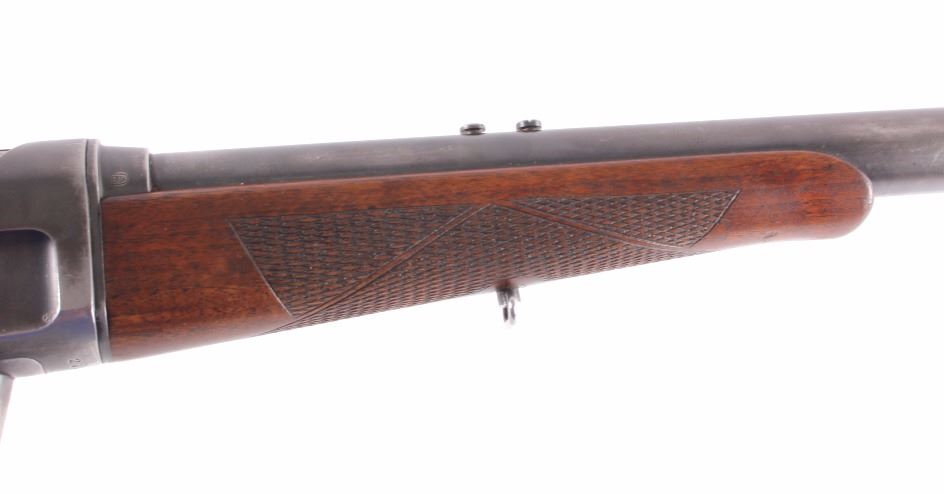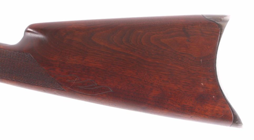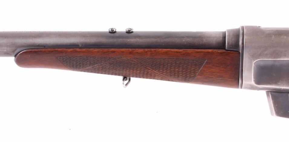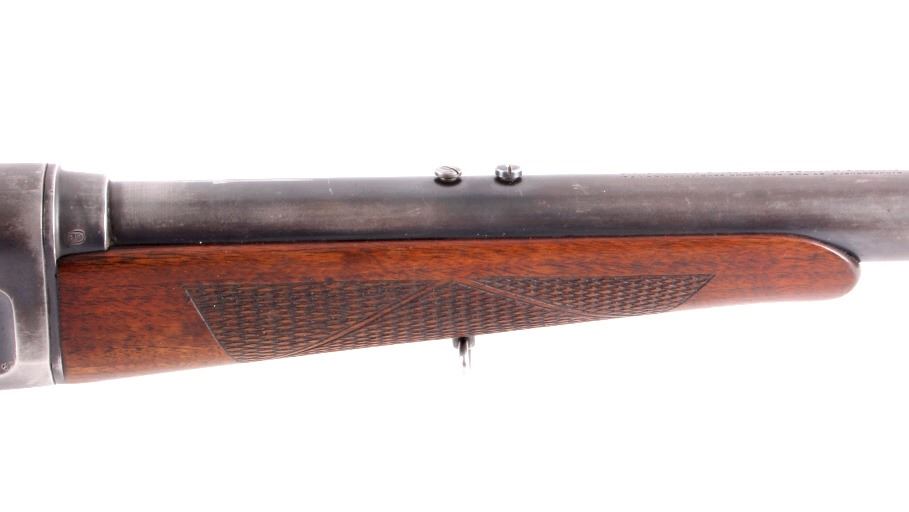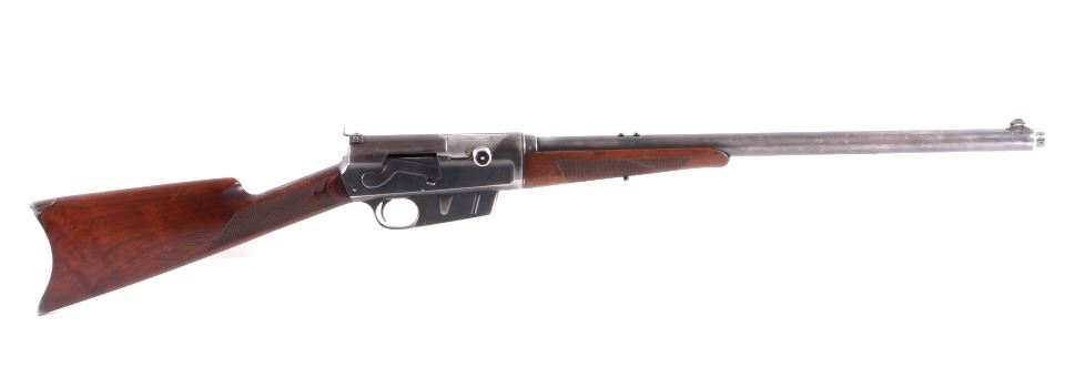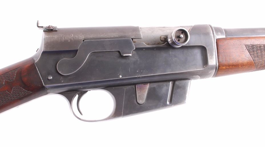 This is a Remington Model 8 .25 semi-automatic rifle chambered in the .25 Remington caliber and manufactured in 1911. The rifle features a blued barrel and receiver with checkered solid walnut hardwood stocks. The rifle has open sporting sights with a rear peep sight. The Remington Model 8 rifle is in good overall condition. The rifle measures 41.25" long with a 21.75" barrel. Serial number is 23600 and the rifle was manufactured in 1911. This firearm requires a Curio & Relic FFL, FFL or NICS background check for transfer.