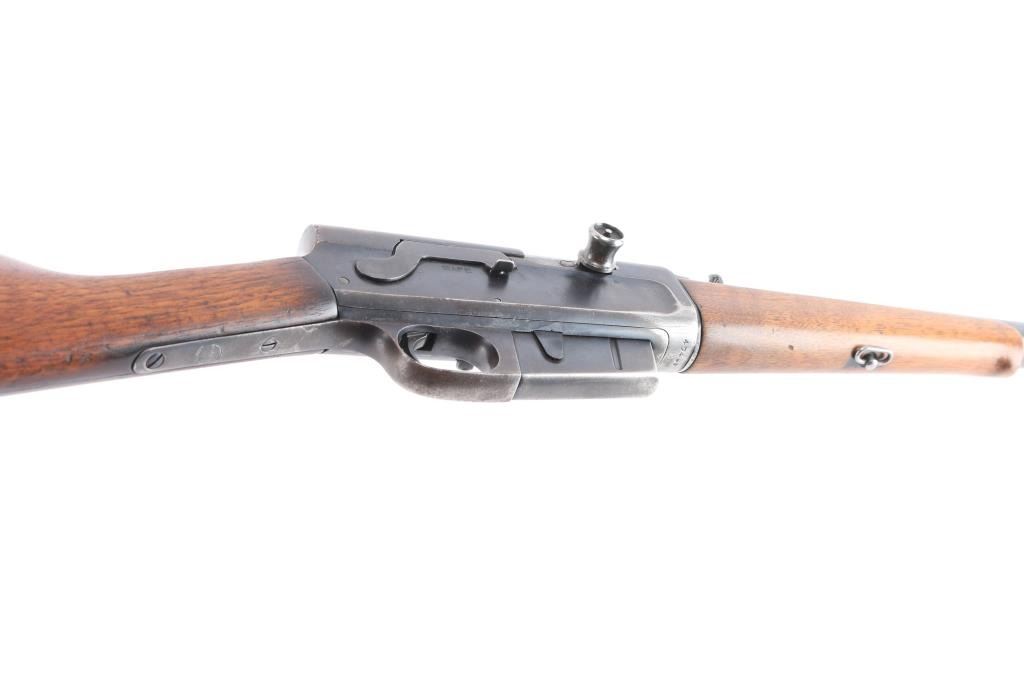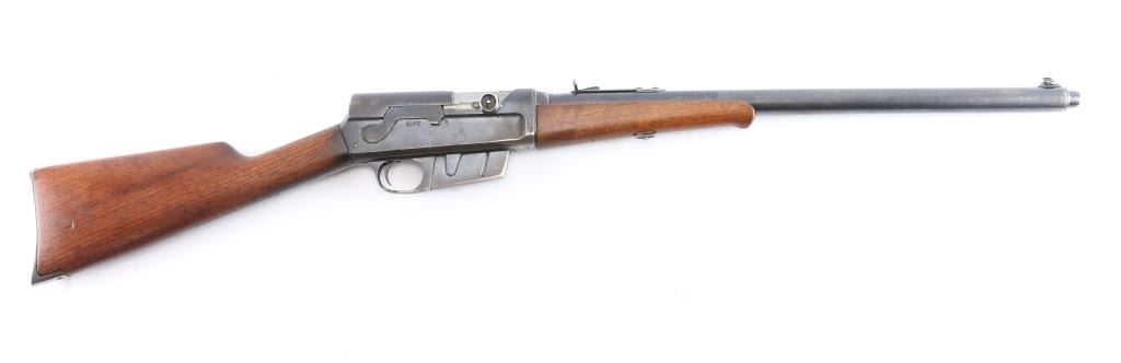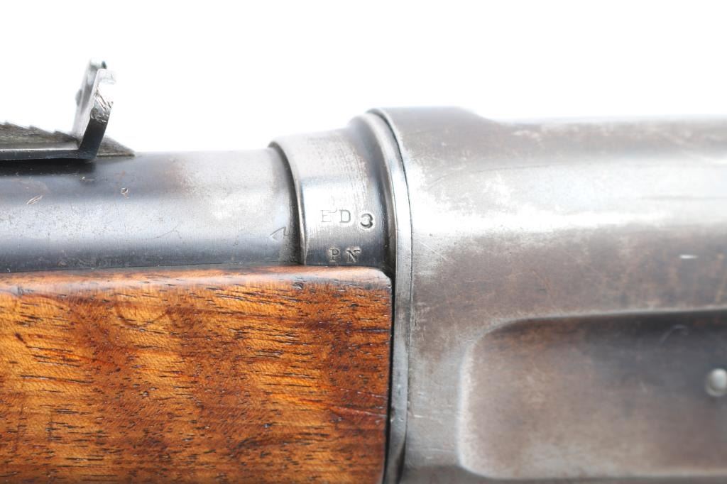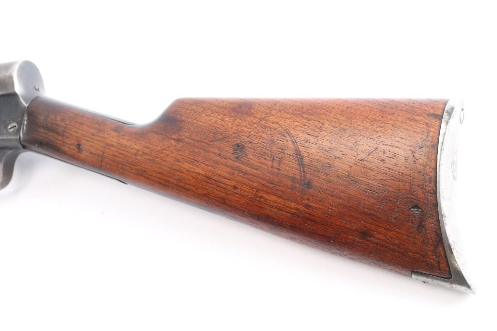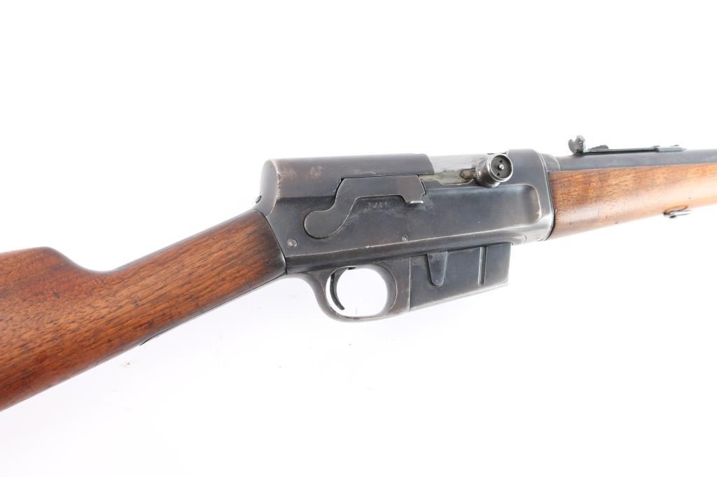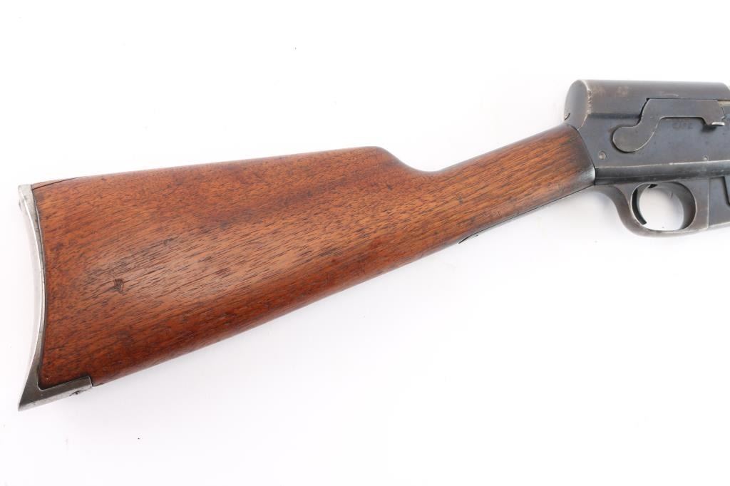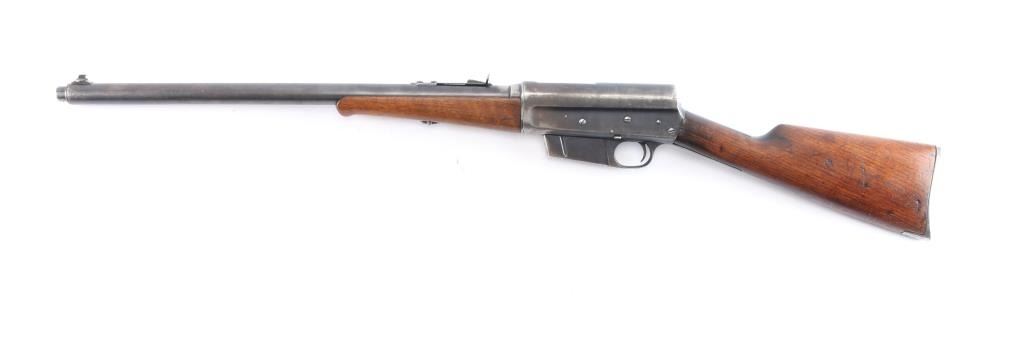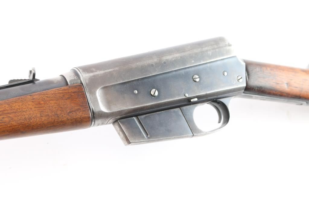 Vintage American made semi-automatic take-down rifle chambered for .35 Remington. Manufactured circa 1922 in Ilion, NY. Rifle features a blued finish, 22" barrel with barrel jacket, dovetailed blade front sight, elevation adjustable buckhorn rear sight, smooth curved trigger, fixed magazine, left side receiver mounted bolt stop, and lever style manual safety. The original hardwood furniture consists of a smooth straight gripped shoulder stock, smooth Schnabel forend with a sling swivel, and smooth steel crescent butt plate. The original blued finish retained is approximately 40%, with general thinning, edge wear, and the remainder turning a brown patina. Metal displays light scattered rust along the barrel and on the receiver. Bore is bright with strong rifling, and the action is smooth and crisp. The hardwood furniture is good with scattered scratches and handling marks.