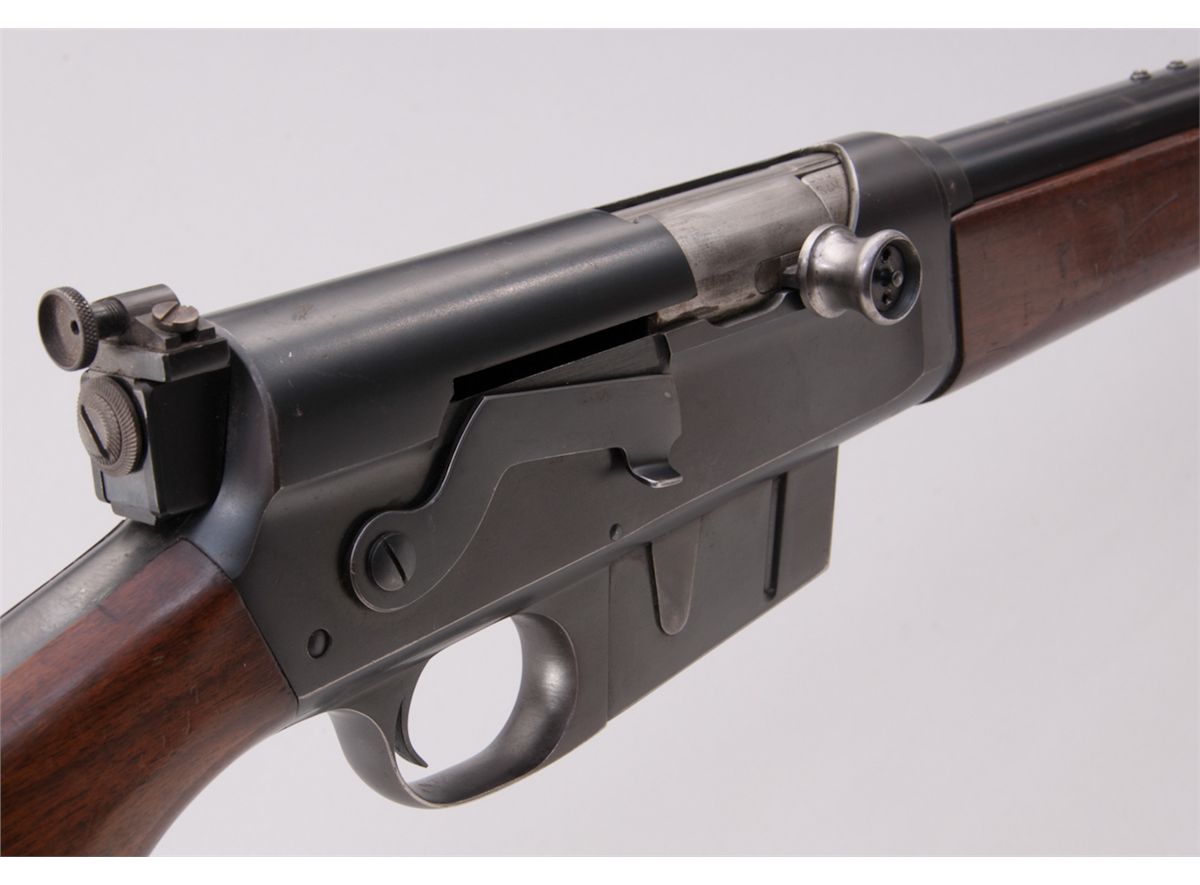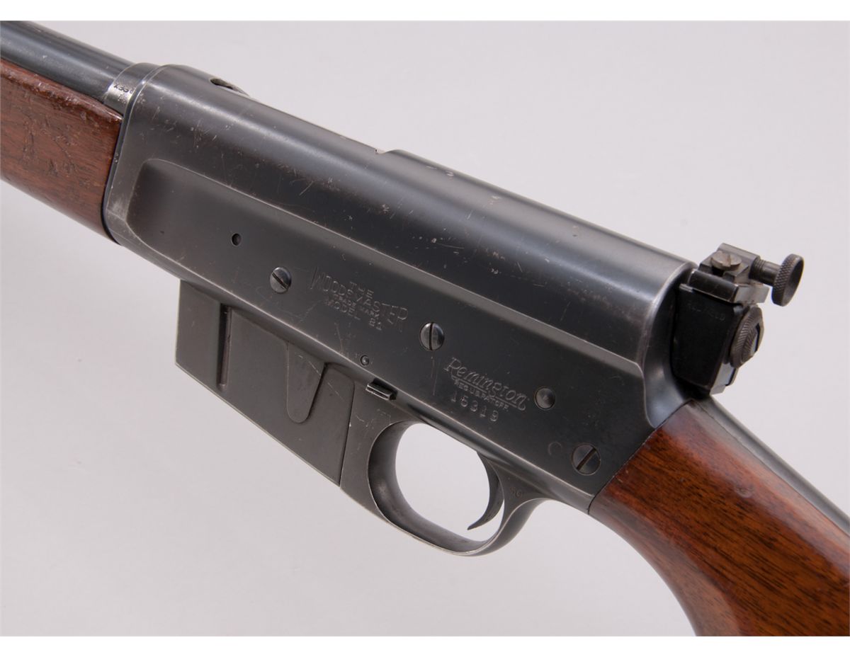 Remington Model 81 ''The Woodsmaster'' Semi-Automatic Rifle, #15319, .300 Sav. cal., 22'' barrel, blue finish, smooth walnut stock, steel checkered buttplate, and centrally mounted receiver peep sight and ghost-ring front. Condition is very good to near fine retaining 92% original finish, with light scuffs, scratches, and minor edgewear. Stock with moderate scuffs from field use. Action is crisp, bore is fine. Est.: $500-$750. (C&R)