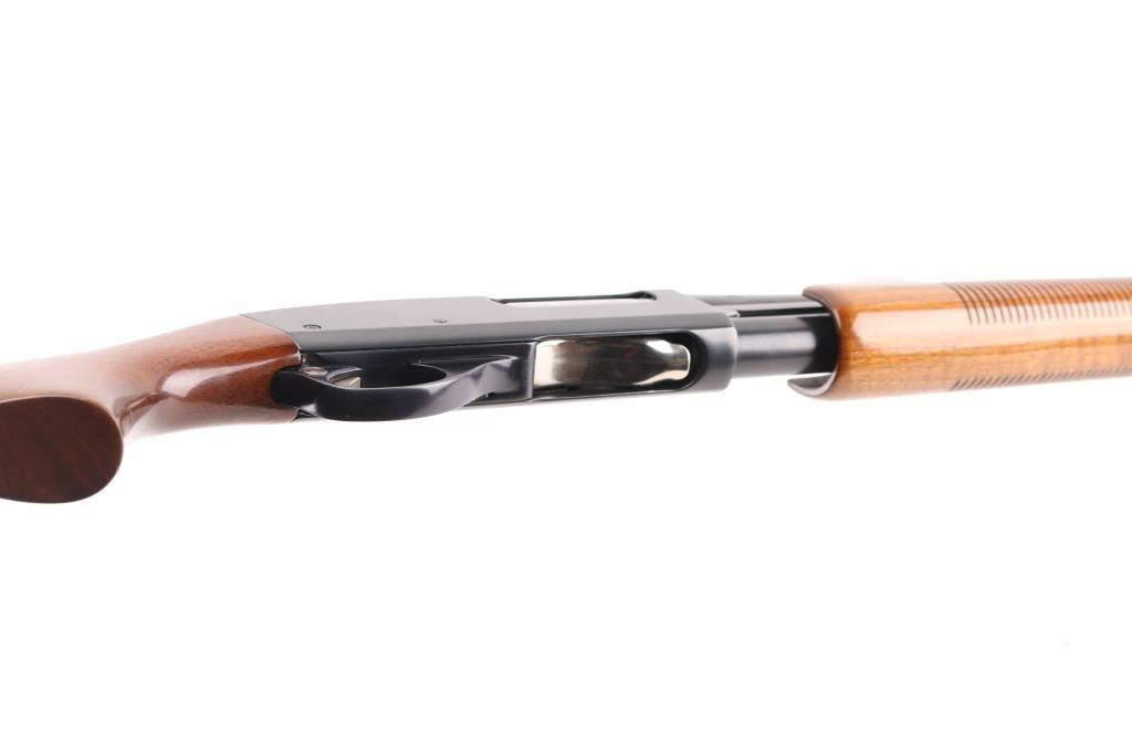 The Remngton 870 'Wingmaster' is a pump action shotgun chambered for 2.75" 12 gauge shells. It has a 25" vent rib, blue finish barrel and receiver with white front bead, steel mid bead, plum colored magazine band, smooth trigger and 3-4 shot magazine tube. Fixed Skeet choke, LOP is 14".Smooth plain wood stock is and forearm with finger grooves above the grooves on both sides. White line rubber recoil pad with black & white spacers. Metal finish looks very good with little signs of handling, a little friction on the tube, wood is excellent, bore is pristine, action is smooth. NRA Condition-Excellent. Modern Firearm.