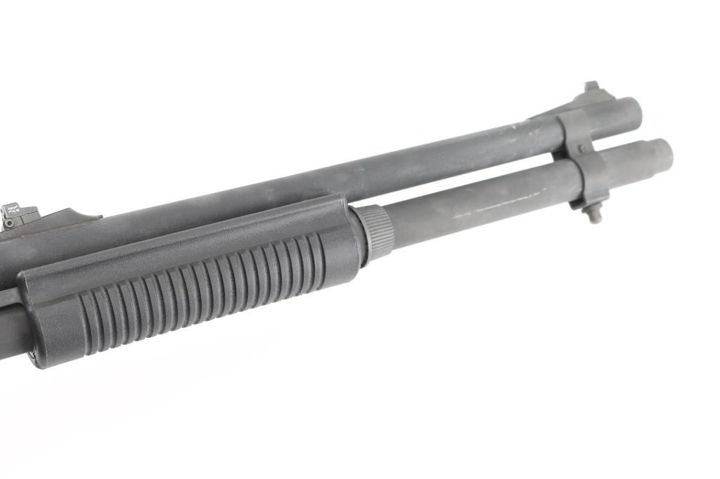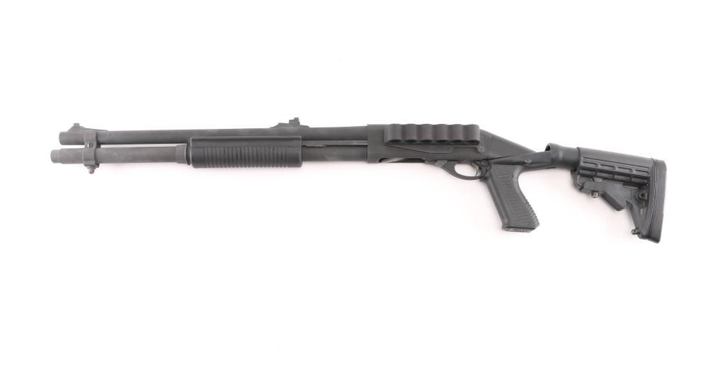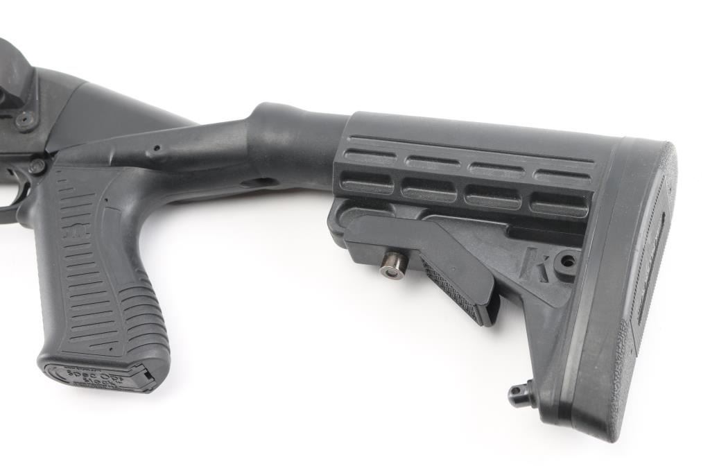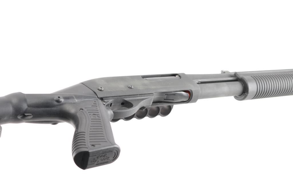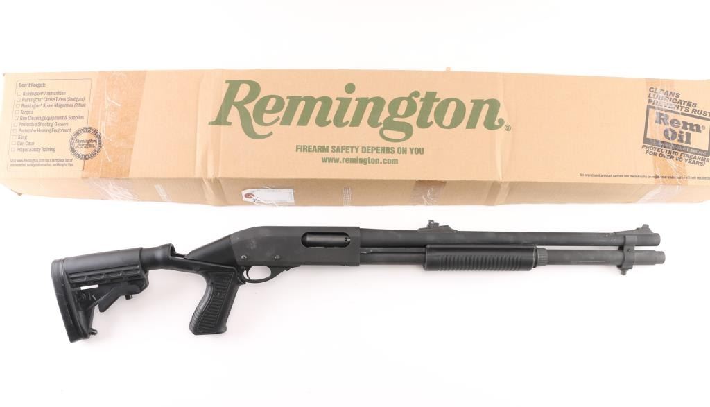 Pump/slide action tactical shotgun chambered for 2 ¾” or 3” 12 gauge shells. Black matte finish, 18.5" barrel, improved cylinder choke, steel bead front sight with no rear sight, receiver not tapped and drilled, 2-shot extended magazine tube, push button safety, Spec Ops Tactical stock with pistol grip, synthetic ribbed pump forearm and Knoxx 4 position Shock recoil absorbing collapsing stock assembly. 6 round shell holder is affixed to the left receiver.. Bore is pristine and action is smooth. Metal parts retain 95% finish with some minor scratches, scuffs. Stock is very good condition. LOP is adjustable. Comes in its original factory box with Remington tactical muzzle brake, Condition is NRA Excellent. Modern Firearm.