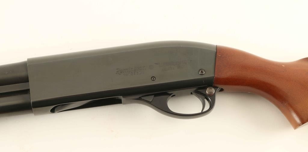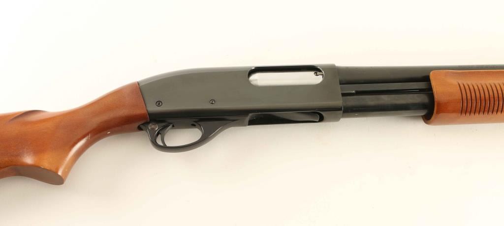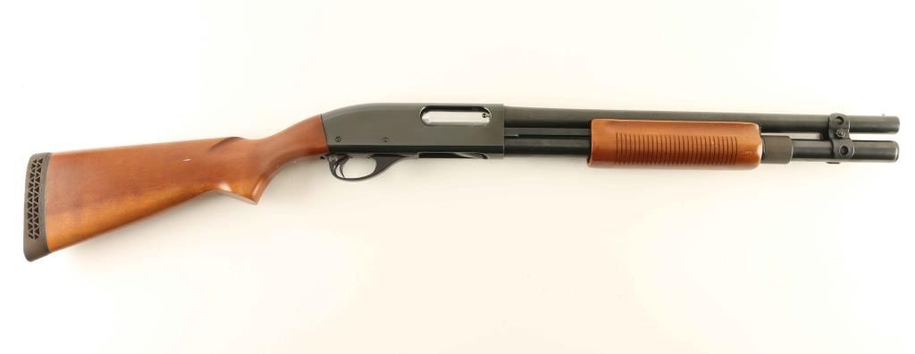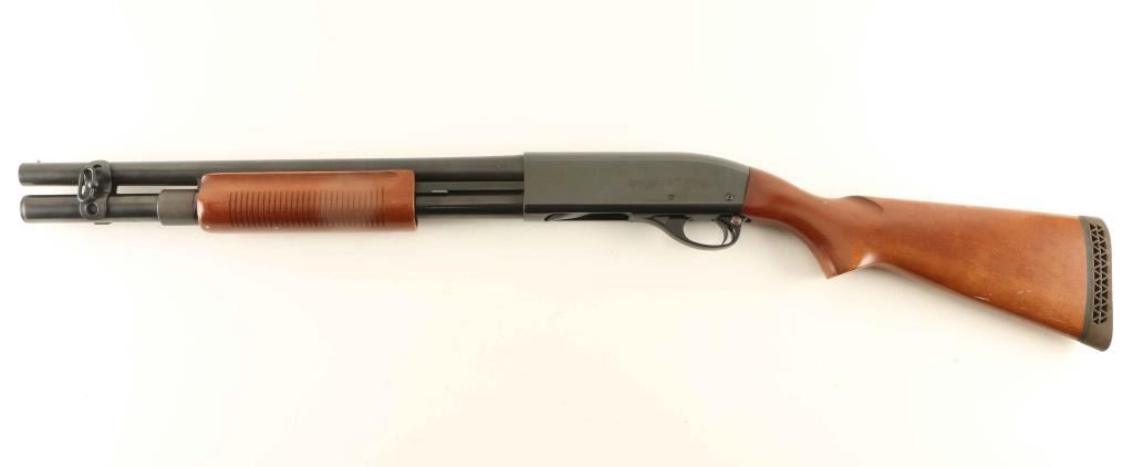 American made slide action repeating shotgun chambered for 2 3/4" 12 gauge shells. Features a blued finish, 18" cylinder choke barrel, silver bead front sight, full-length magazine tube with extension, smooth trigger with beveled edges, alloy trigger guard, push button safety, steel receiver, grooved walnut slide handle with finger grooves and pistol grip shoulder stock with factory recoil pad. Shotgun exhibits approximately 97% of it's original blued finish showing few handling marks and light action wear on the slide arms & magazine tube. Action is smooth, the bore appears excellent but is slightly dirty and the wood stocks are near fine with minor blemishes & some splattered white paint. Condition is near NRA Excellent. ***Modern Firearm***