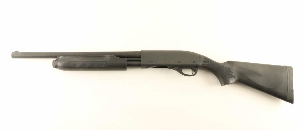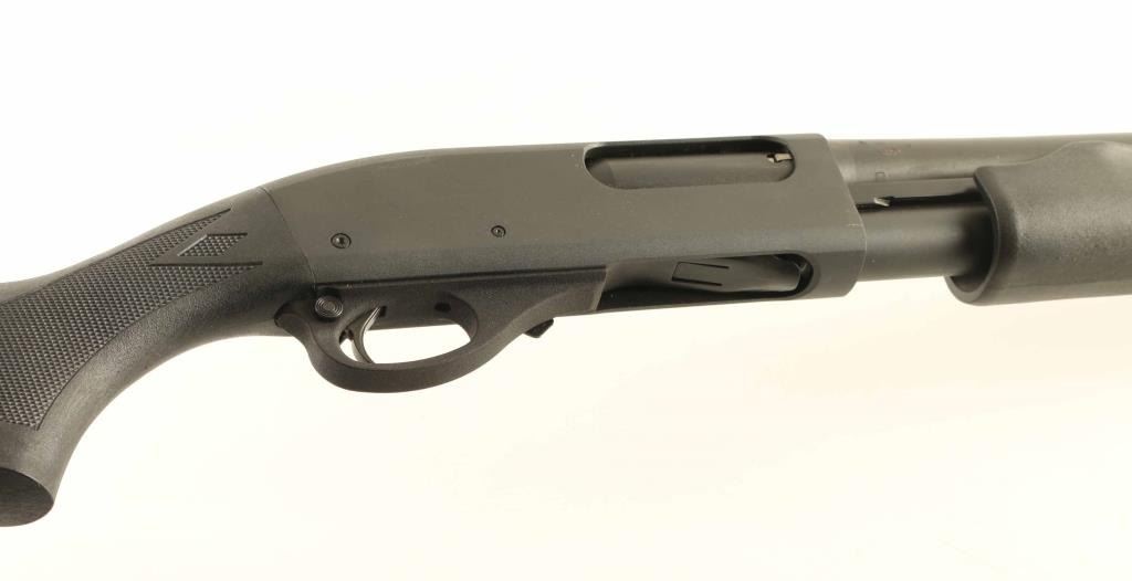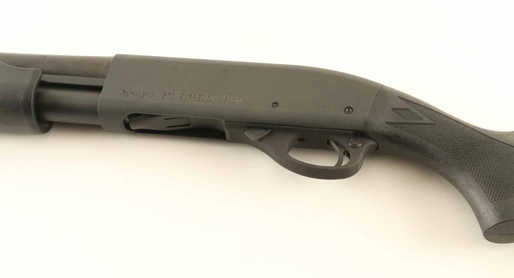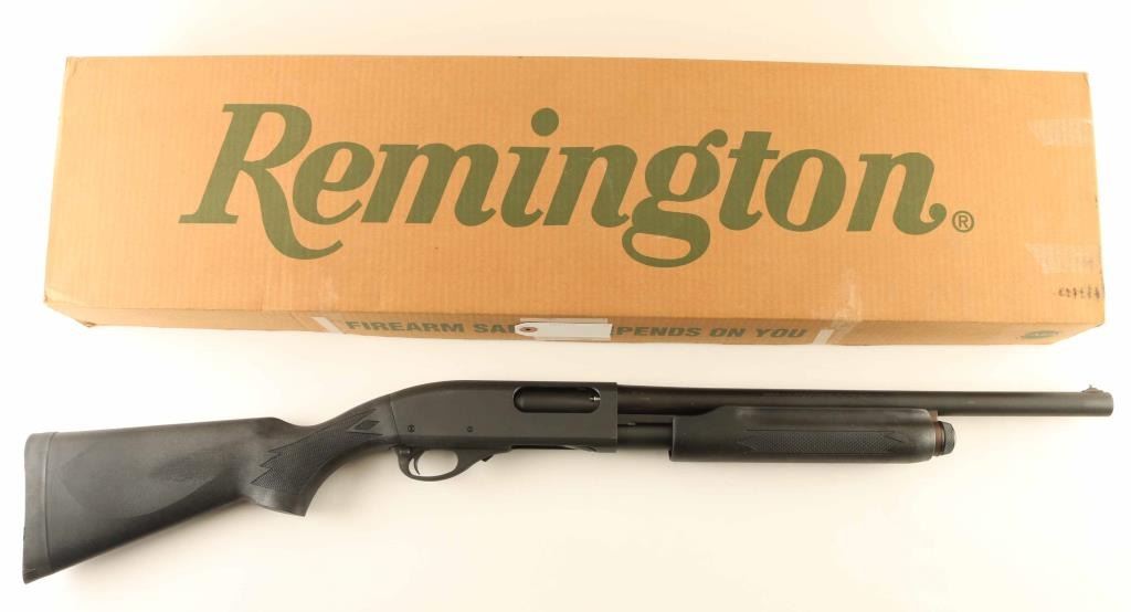 SN: B711127M Remington 870 Express Magnum Pump Action Shotgun. Takes 2 3/4" or 3" shells and has an 18" barrel, front bead sight, black synthetic stock with flat black barrel and receiver. Comes with box, and mag tube plug. NRA Excellent Modern Firearm