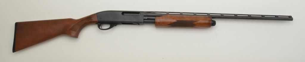 Remington Model 870 Express pump action shotgun, .410 gauge, for 3” plastic shells, 25” ventilated rib barrel, mat black finish, checkered wood stocks, #A258509H in factory green cardboard box with insert and instructions manual. This gun is in like new condition showing little handling. Est.: $300-$600.