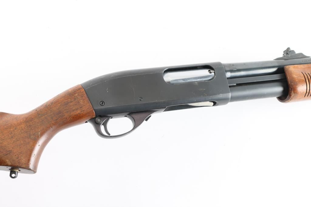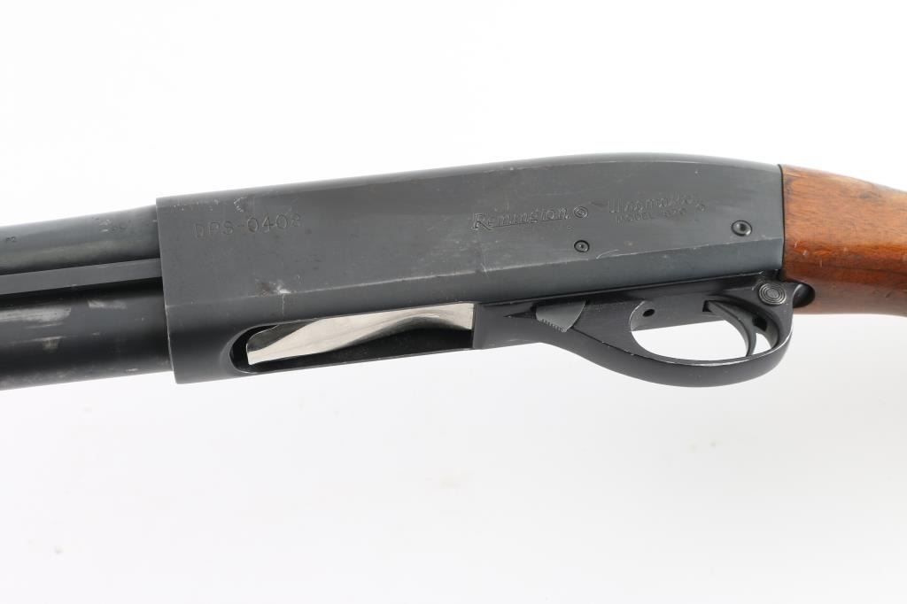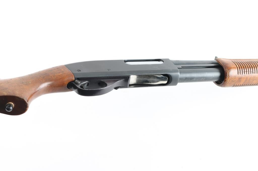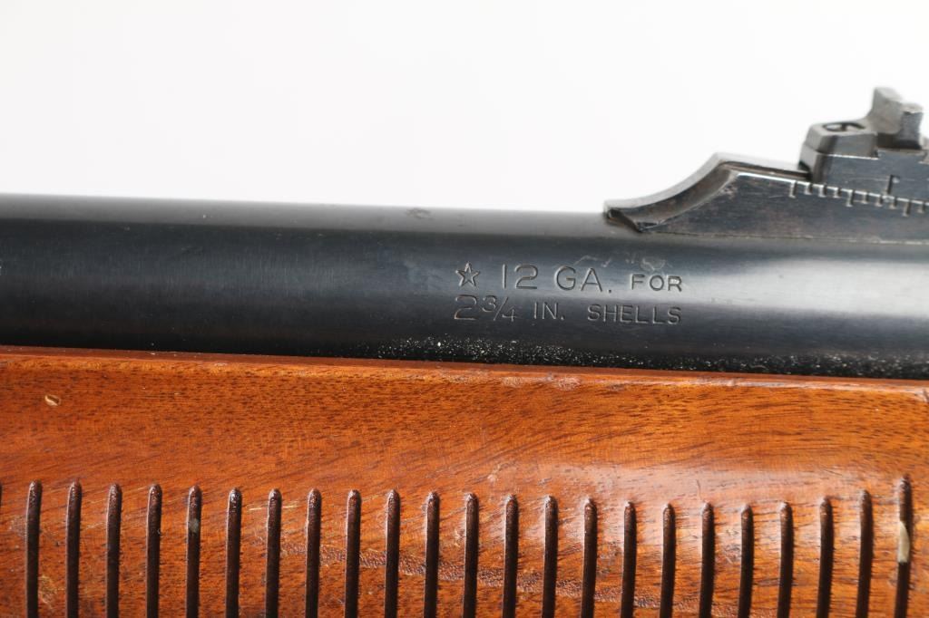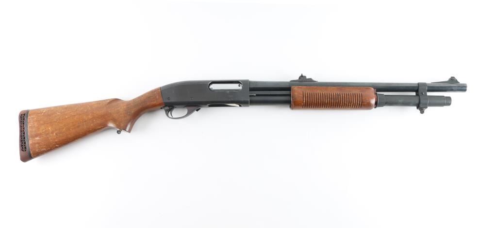 Quality American made slide action repeating shotgun chambered for 2 3/4" 12 gauge shells. Police issued shotgun, left receiver is stamped DPS-0408. (Dept. of Public Safety) Features a blued/matte finish, 20" modified choke barrel, ramped post/bead front, and slide adjustable notch rear sights, magazine tube extension, push button safety, beveled trigger, swivel stud, grooved walnut slide handle and smooth pistol grip shoulder stock with factory recoil pad. Shotgun exhibits approximately 85% of it's original finish with slide wear on the magazine tube and scattered handling marks/scratches. Action is smooth, bore appears good, needs cleaning, and wood stocks are sound with numerous scratches, and handling loss to the finish. NRA Condition-Good. Modern Firearm