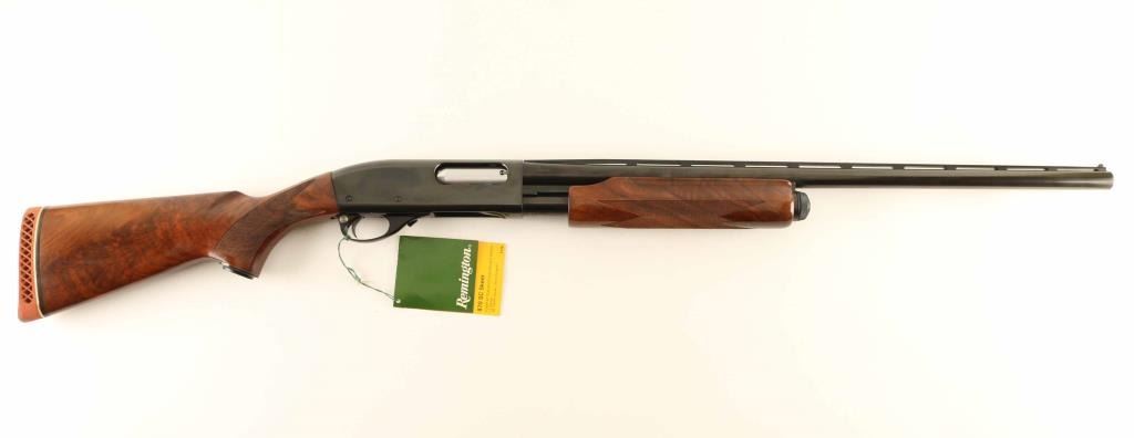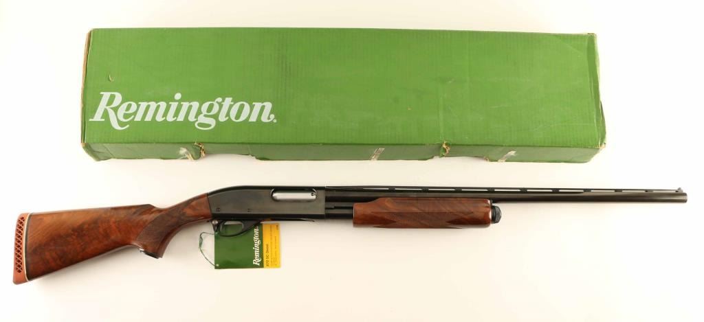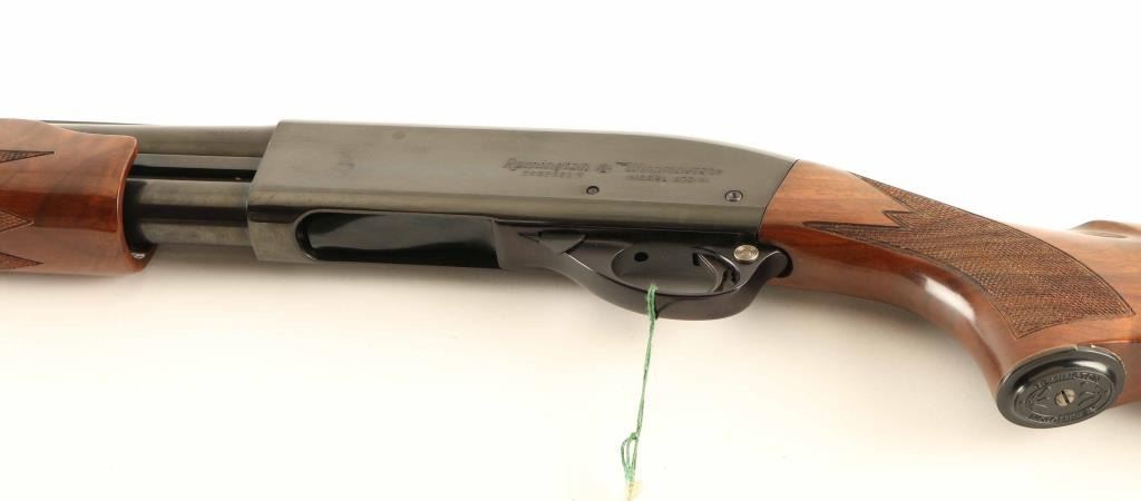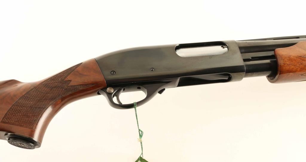 'Skeet' High quality American made slide action repeating shotgun chambered for 2 3/4" 12 gauge shells, manufactured circa 1977. Features a polished blued finish, 26" skeet choked barrel with ventilated sighting rib, white bead front sight, silver mid-sight, half length tube magazine, smooth trigger with beveled edges, push button safety, dual action bars, polished bolt, hand checkered select walnut slide handle with gloss finish, and pistol grip shoulder stock with black grip cap & factory recoil pad. Includes the original factory cardboard box with hang tag & manual. Shotgun exhibits approximately 99%+ of it's original finish showing little to no visible wear. Action is smooth, the bore is mirror bright and the select wood stocks are fine with minor imperfections. Condition is like NRA Perfect in box. ***Modern Firearm***
