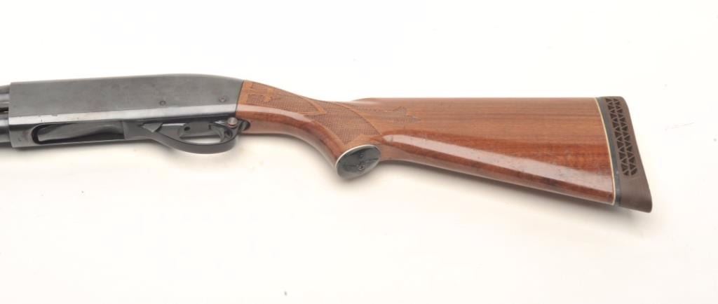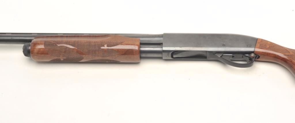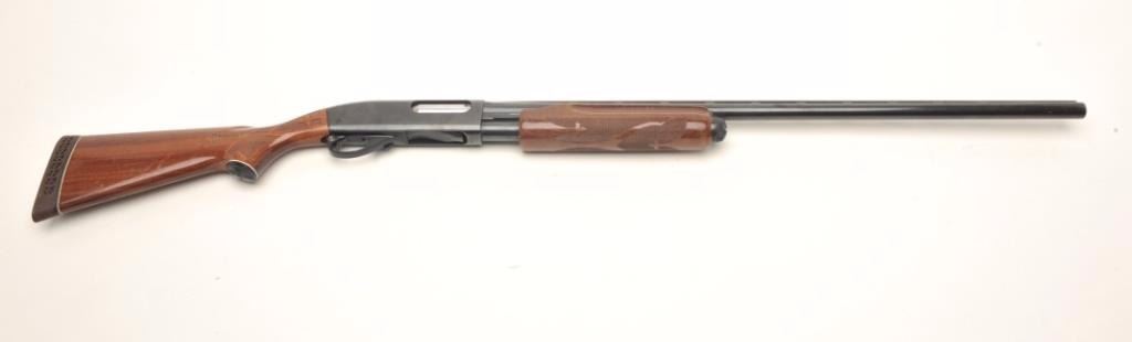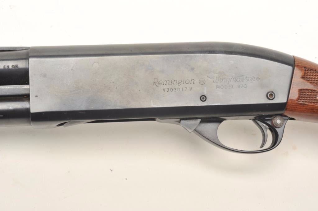 Remington Model 870 Wingmaster pump shotgun, 12 gauge, serial #V303017V. The shotgun is in very good overall condition with a 28” barrel with a full-length ventilated rib and steel bead front sight. The barrel andreceiver retain nearly all of their polished blue finish with small mars and light surface erosion noted. The checkered wood stocks are in good condition with small mars, dents and compressions consistent with field use.The butt ends with a ventilated rubber Remington marked recoil pad and a 14” LOP. The bore is very good, the action crisp and markings are sharp. Est.: $200-$400. (Modern).