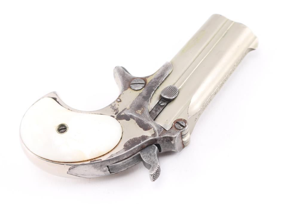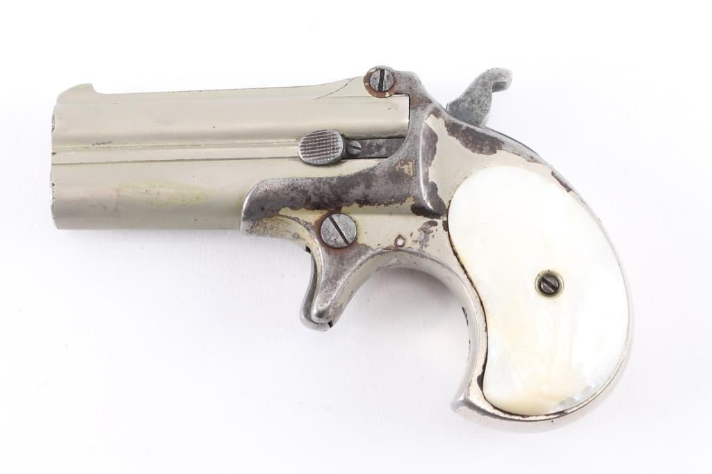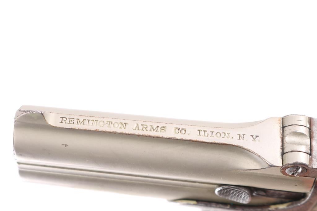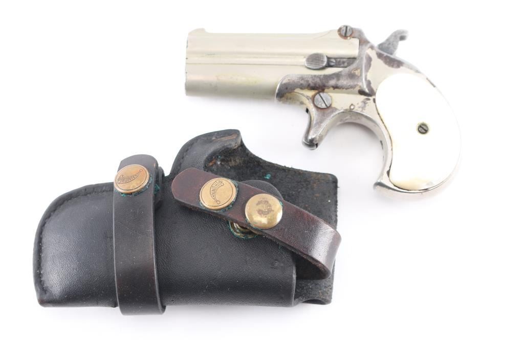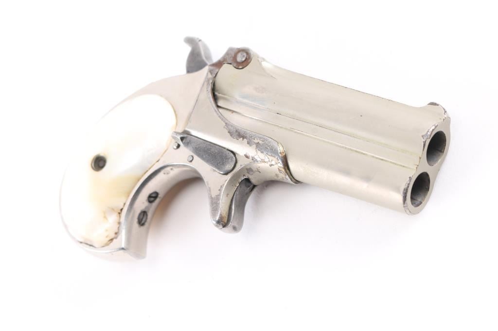 #663 Vintage over/under double barrel derringer chambered in .41 Rimfire Short, manufactured circa 1888-1911. Features nickel finish, 3" barrels with solid sighting rib marked "REMINGTON ARMS CO. ILION, N.Y", fixed blade front sight, u notched rear sight, smooth spur trigger, knurled hammer spur, manual extractor, auto-rotating barrel selector, steel frame and two-piece smooth mother of pearl grips. The frame is stamped with batch # 663 under the grips. Bore is good condition, showing some frosting, strong even rifling, little pitting. Retains little finish, mostly a grayish color with some darker colors from patina, little bright nickel on frame. Grips are fair to good, with small amount of chipping. Action is smooth with clean let-off. Includes good condition dark leather belt holster.Condition is NRA Good+*** C&R Firearm ***