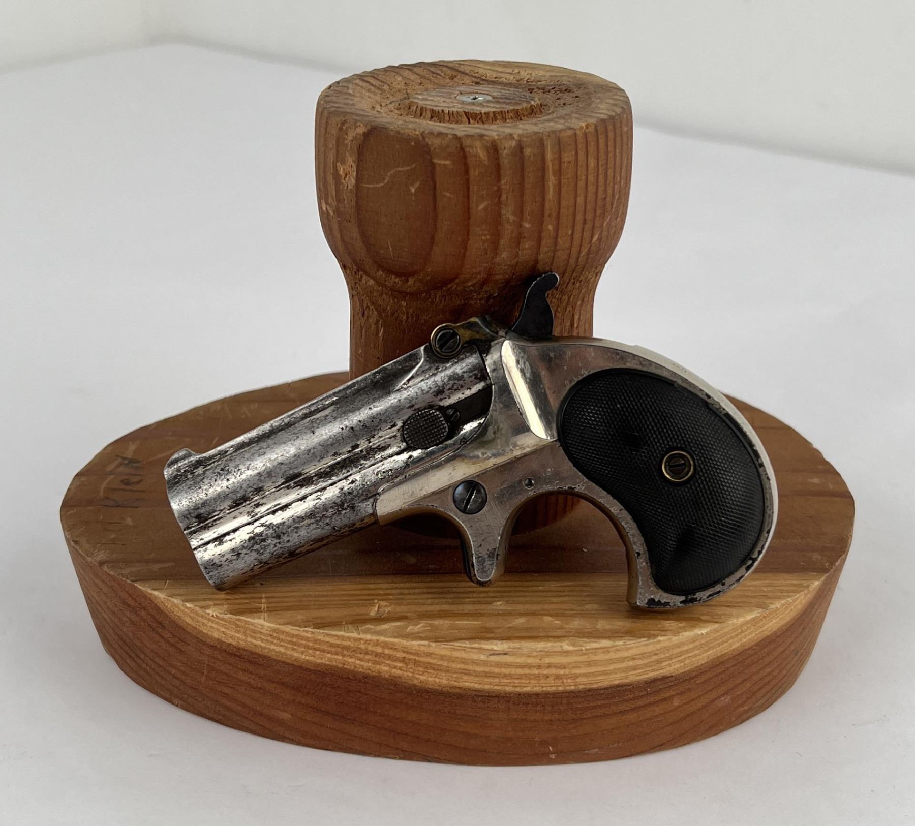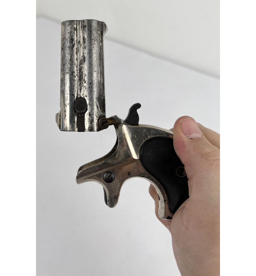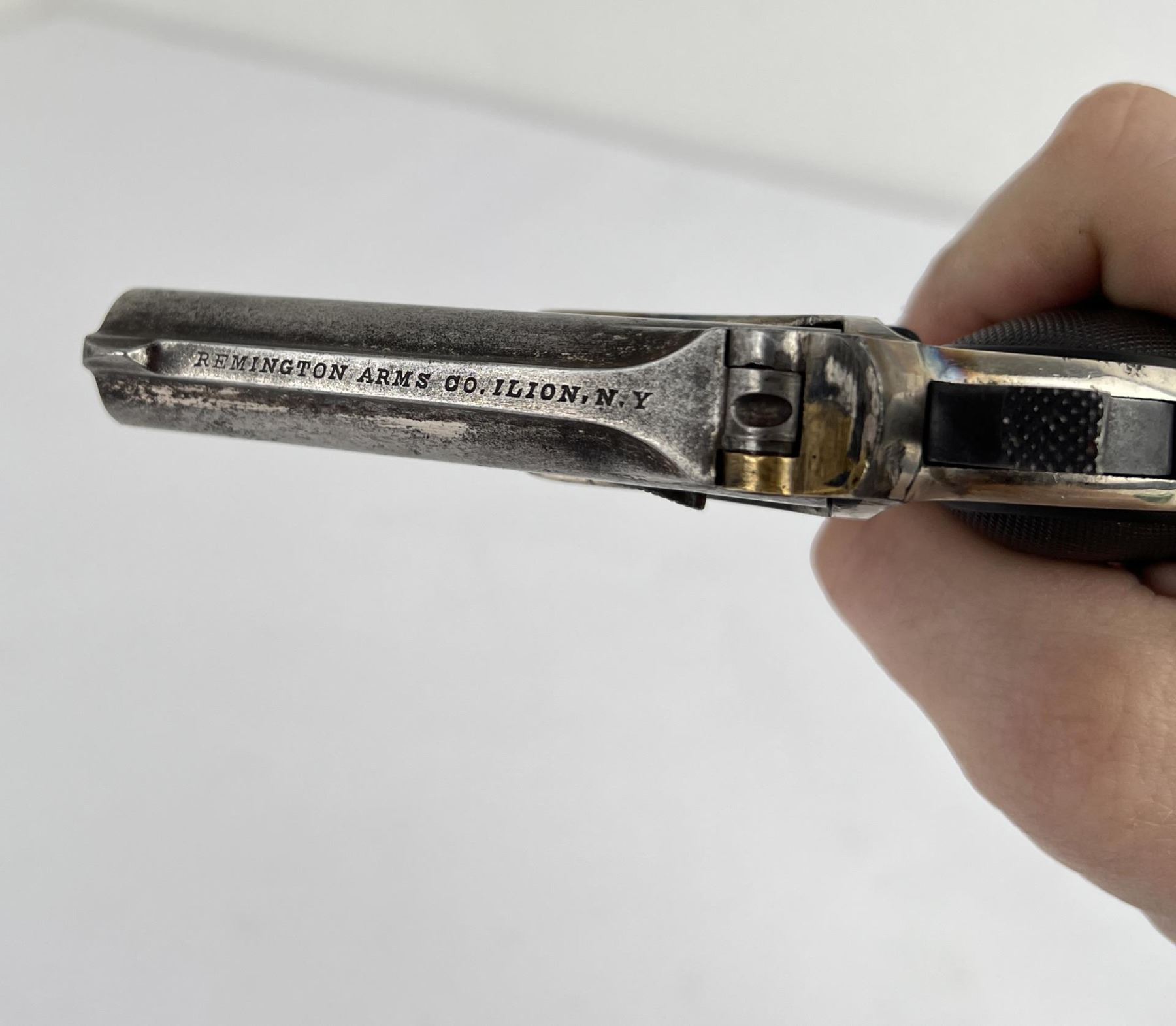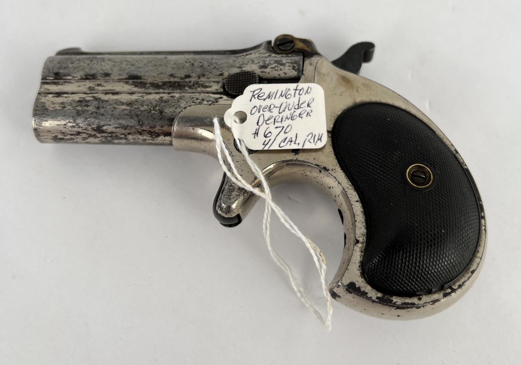 Type II, Serial Number 670 bottom of barrel and on frame under left grip. Cal. 41 Rim Fire short, 3" round superposed barrels tilt upward for loading and unloading. Lift tilt pivot pin area shows professional period repair. Original hard rubber grips in good condition. Top of barrel stamped "Remington Arms CO. Ilion, N.Y." Barrel lockup is tight. Considerable nickel remains on frame. Requires FFL Transfer.