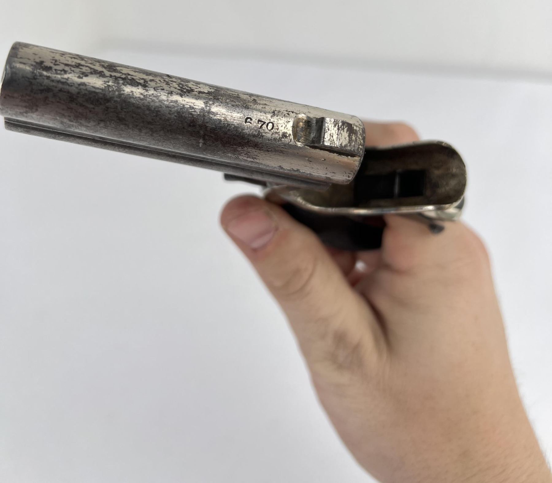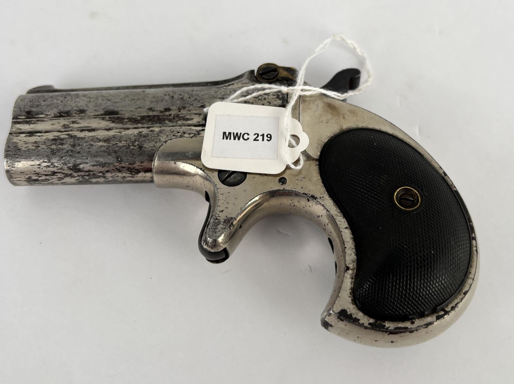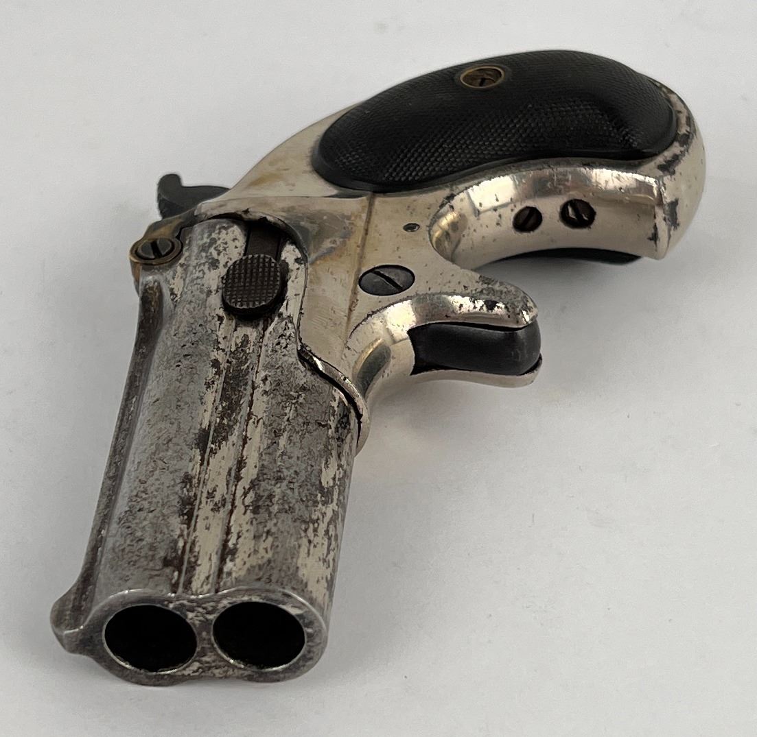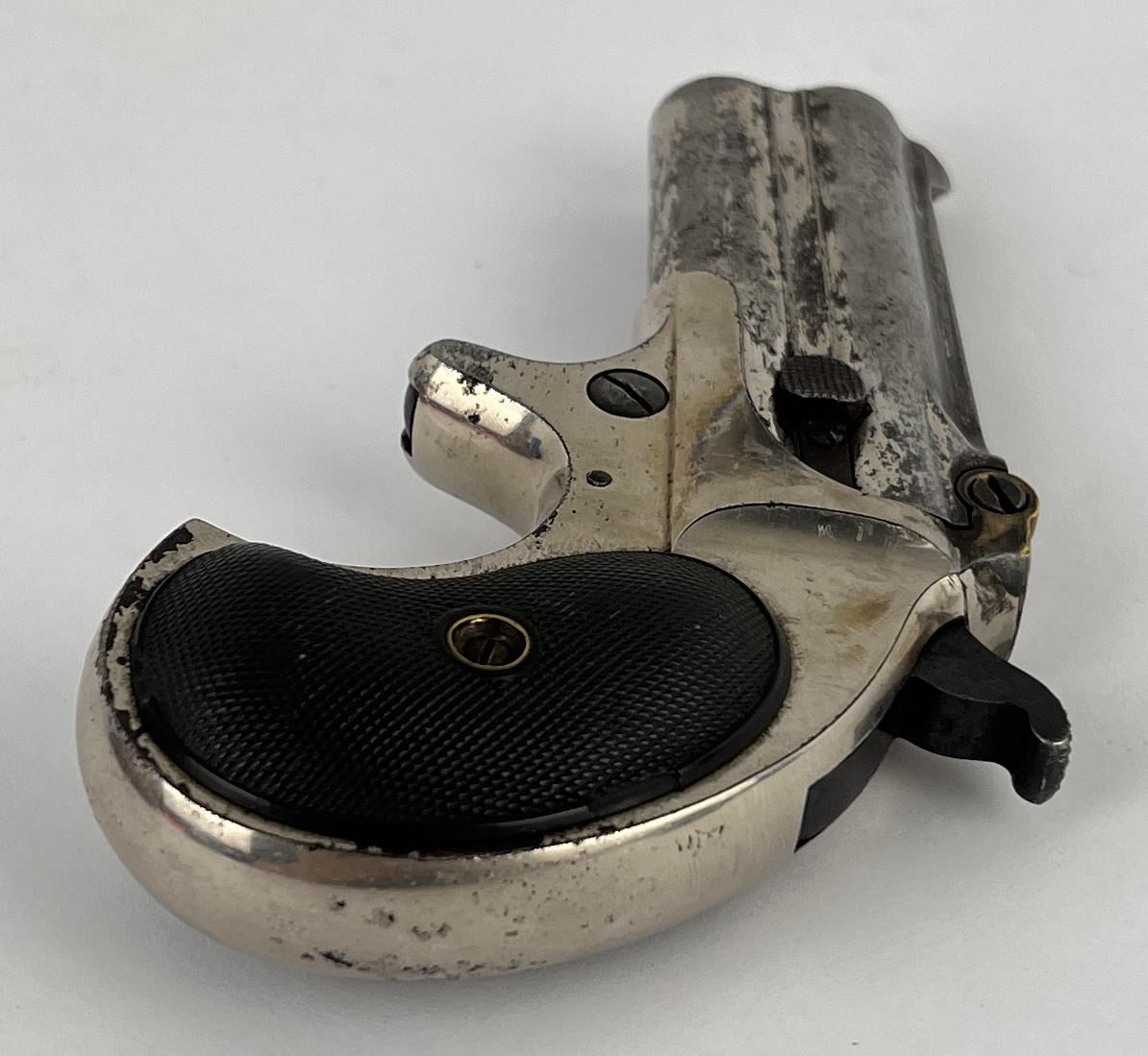 Type II, Serial Number 670 bottom of barrel and on frame under left grip. Cal. 41 Rim Fire short, 3" round superposed barrels tilt upward for loading and unloading. Lift tilt pivot pin area shows professional period repair. Original hard rubber grips in good condition. Top of barrel stamped "Remington Arms CO. Ilion, N.Y." Barrel lockup is tight. Considerable nickel remains on frame. Requires FFL Transfer.