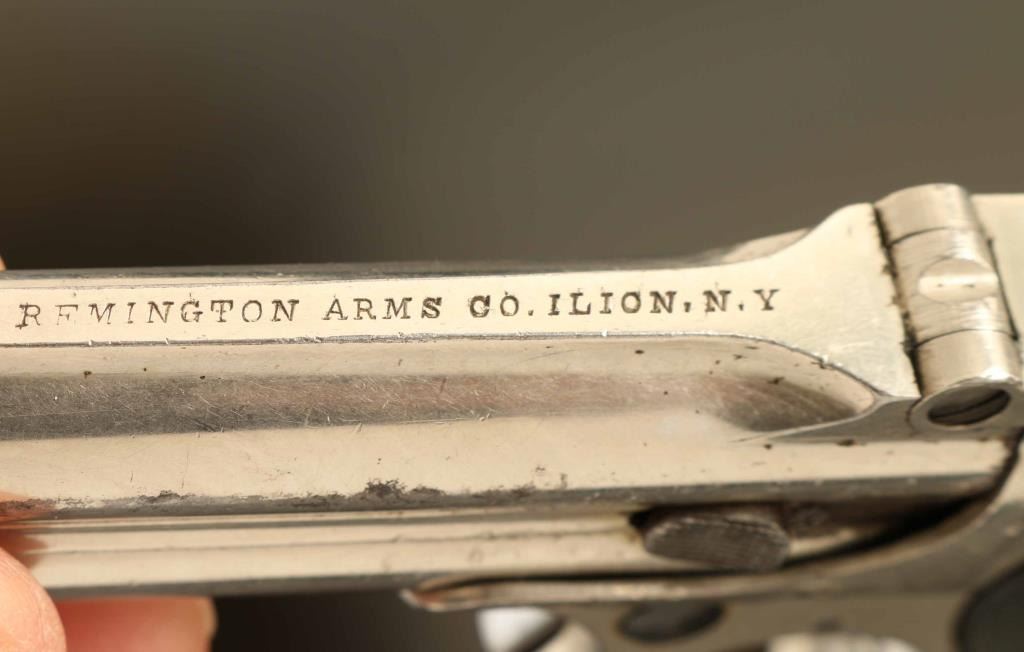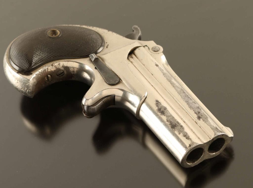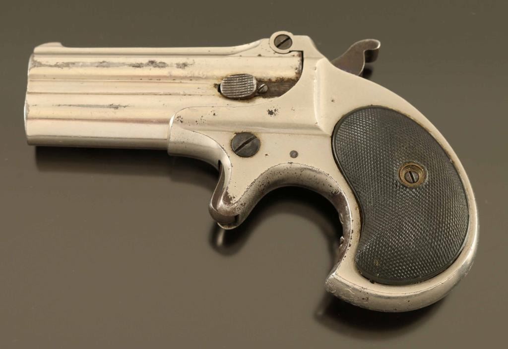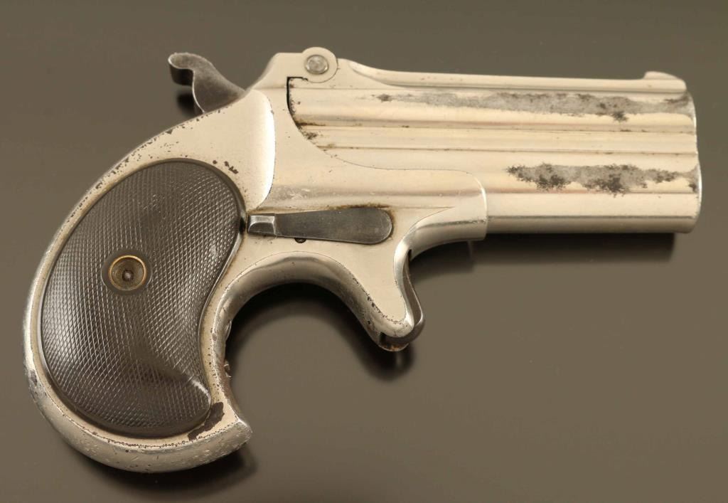 Vintage over/under double barrel derringer chambered in .41 Rimfire Short, manufactured circa 1888-1911. Features a nickel plated finish, 3" barrels with solid sighting rib marked "REMINGTON ARMS CO. ILION, N.Y", fixed blade front sight, 'u' notched rear sight, smooth spur trigger, knurled hammer spur, manual extractor, auto-rotating barrel selector, steel frame and two-piece checkered black hard rubber grips. The barrel is stamped "38" and the frame is marked "875". The derringer displays an older cloudy nickel plated finish on the frame and a brighter nickel plated finish on the barrels. Overall approximately 80% plated finish is retained showing losses, dings and a small amount of dark rust. Action is sound, the bores are poor with pitting, the markings are good and the synthetic grips are good with the left panel a likely reproduction. Condition is NRA Good. ***C&R Firearm***