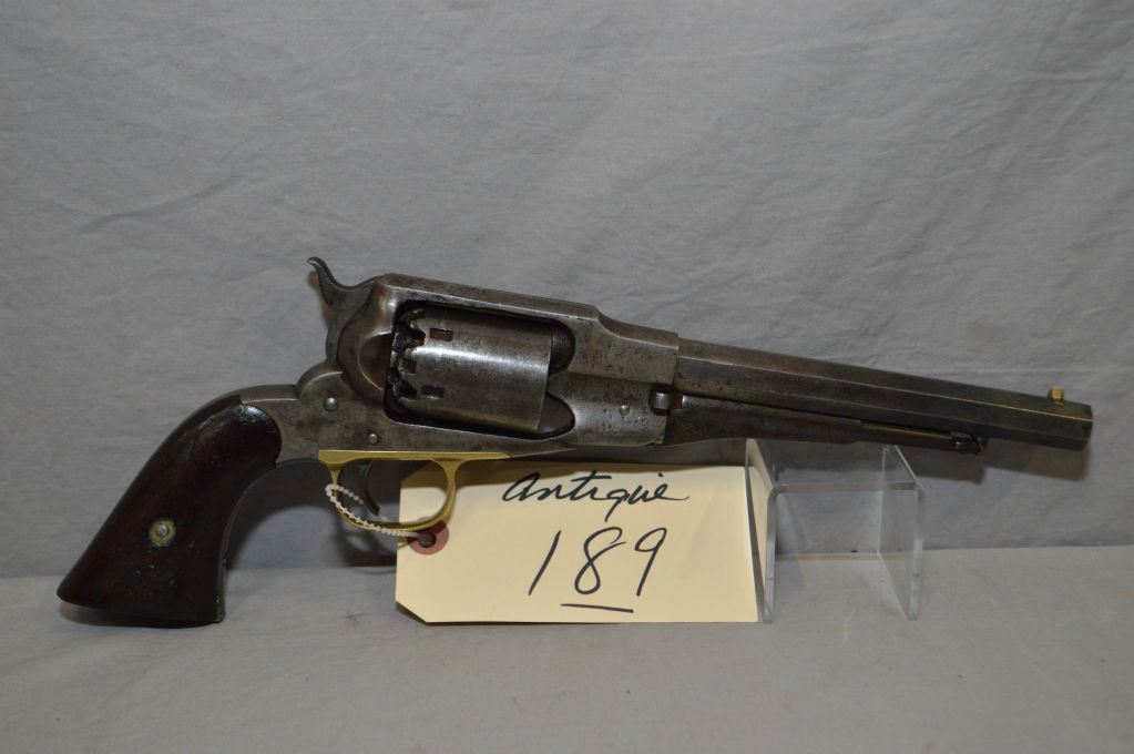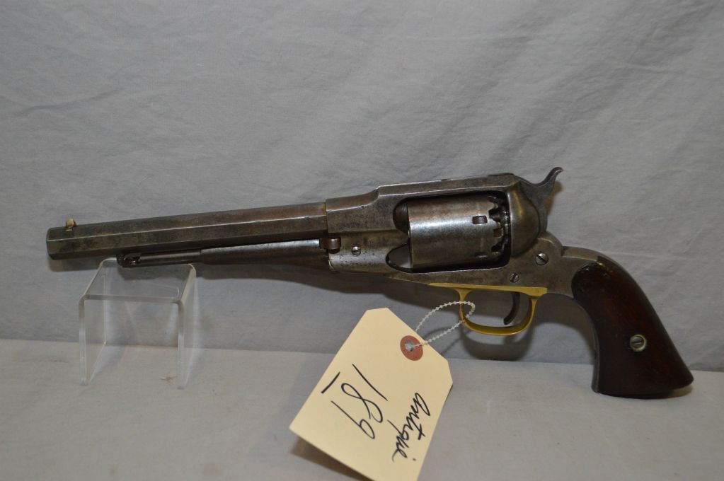 Remington Model New Model Navy .36 Perc Cal 6 Shot Revolver w/ 7 3/8" octagon bbl [ faded patchy blue finish, worn brass trigger guard stamped with B , walnut grips, barrel marked "Patented Sept. 14, 1858, R.E.Remington & Sons. Ilion New York. U.S.A. " On two lines, no visible New Model markings, Circa 1863 - 1878, Total Production Approx. 28,000 ] Ser # 23252 ANTIQUE NO PAL REQ