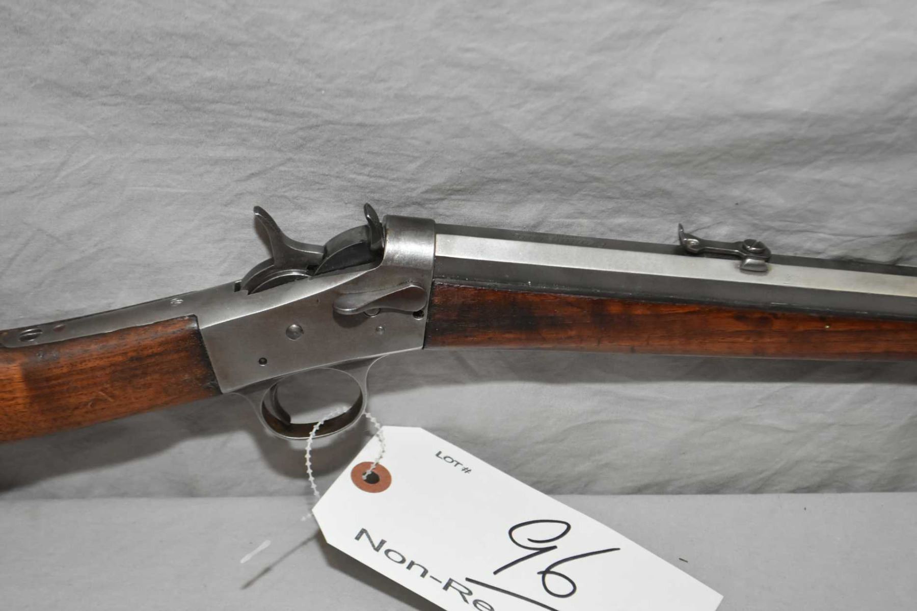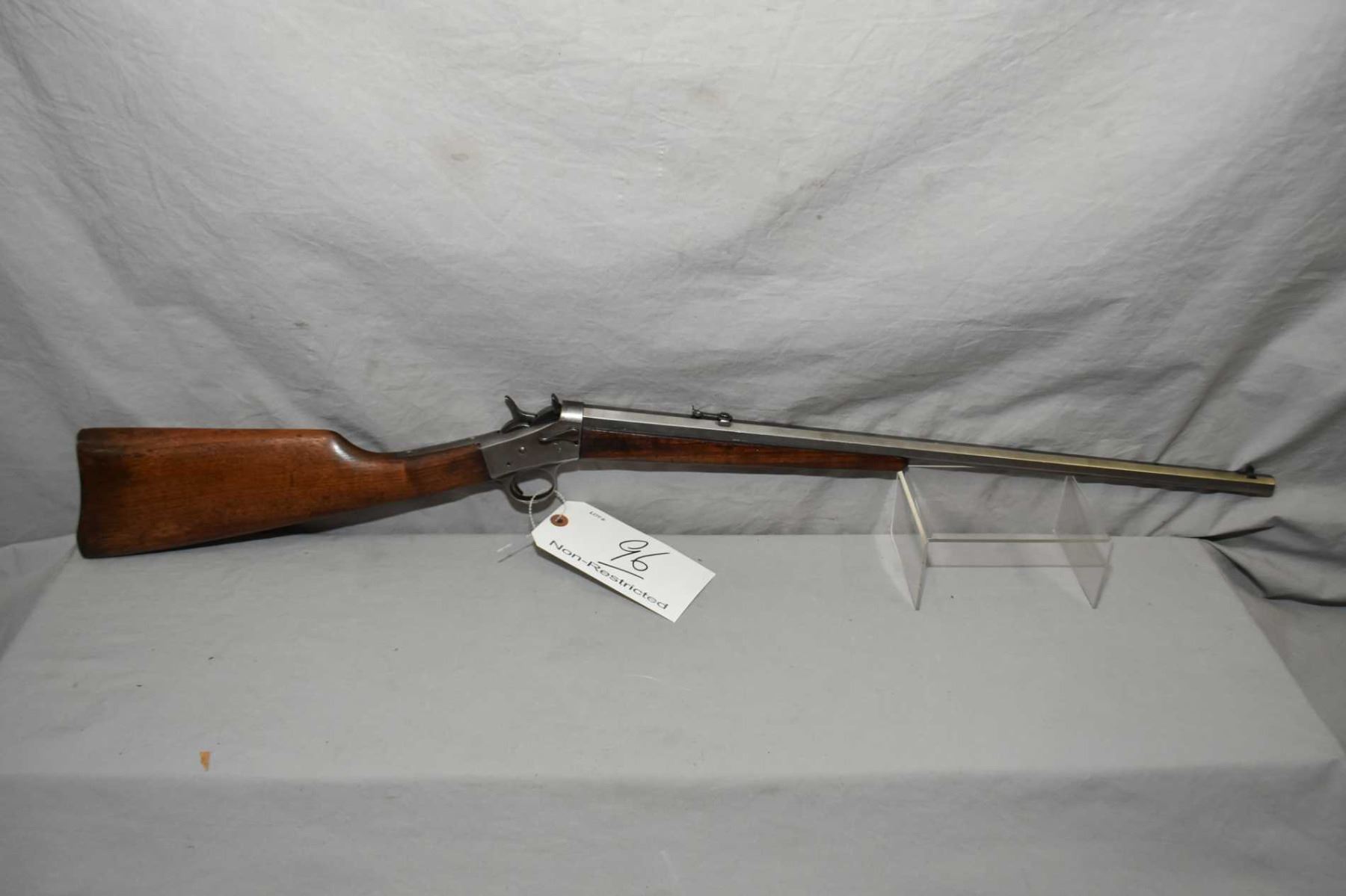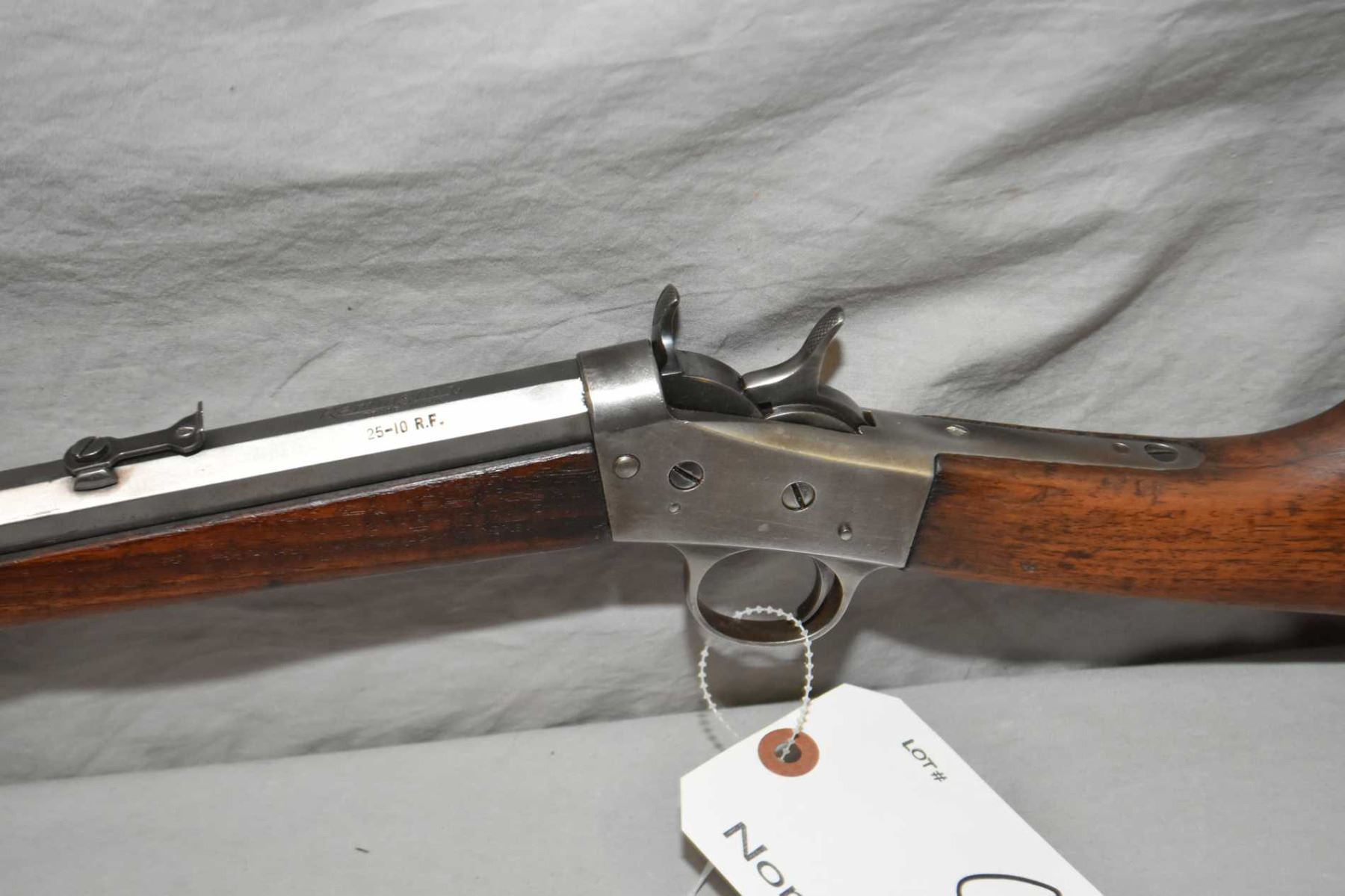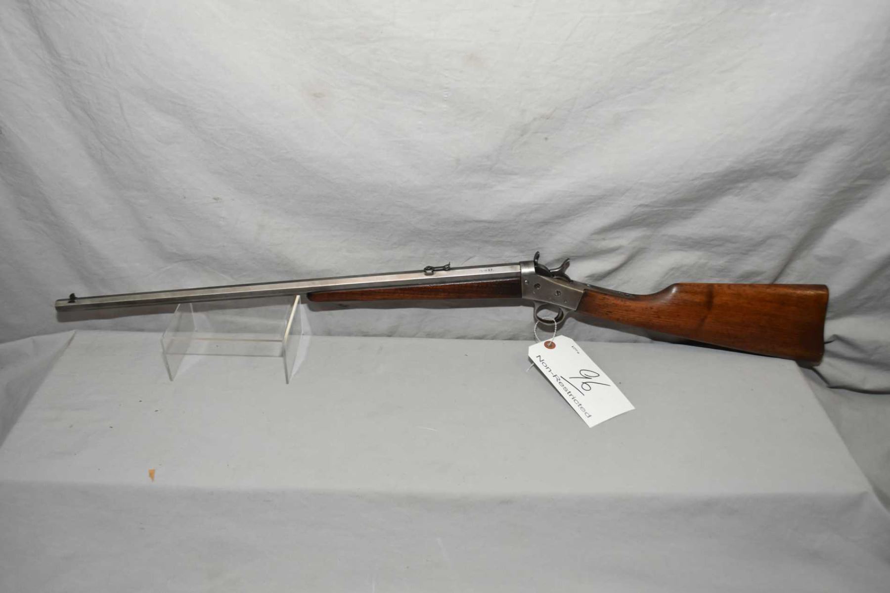 Remington Model No. 4 Relined to .22 LR Cal From .25 - 10 Rimfire Cal Single Shot Rolling Block Rifle w/ 24 1/2" tapered octagon bbl [ grey finish, take down model, barrel sights, walnut stock with crack repair behind receiver, and slight age crack behind upper tang, Remington UMC metal butt plate, good forewood, some slight marks to metal and wood ] Ser # J299242