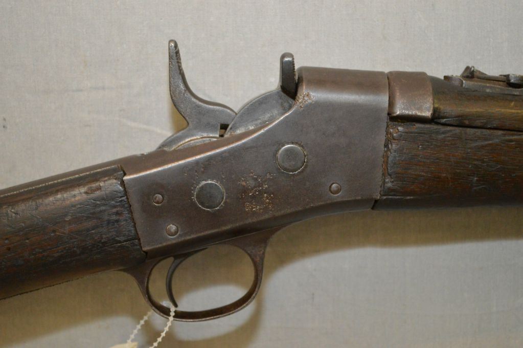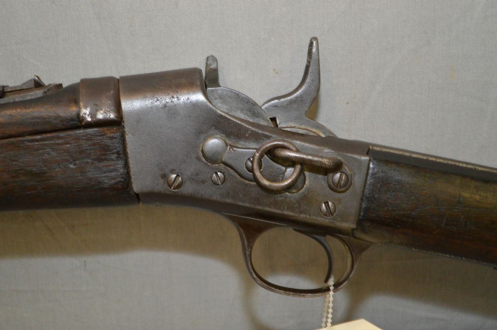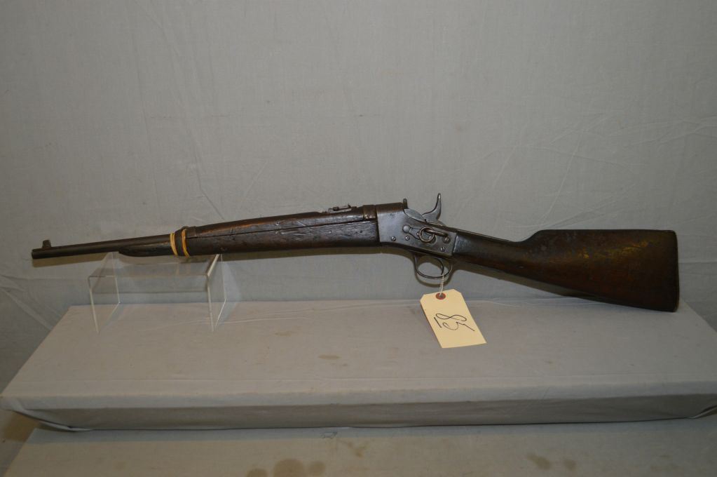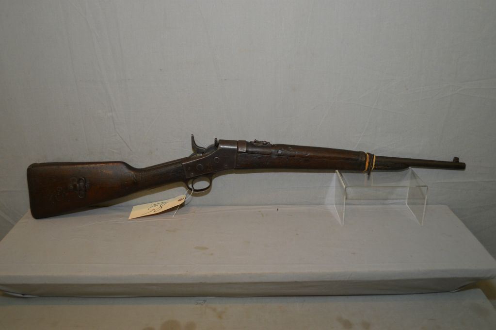 Remington Model No 5 .30 US ? or .7 MM cal Saddle Ring Carbine w/ 20" bbl [ reblued finish, carbine sights, w/saddle ring & sling swivels, proper period wood with character, & carved intials, note : elastic to hold on barrel bands ] Ser # No Visible Serial number