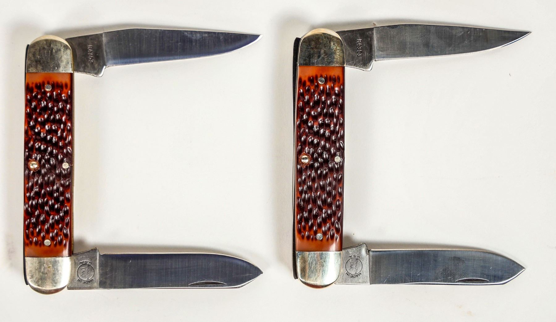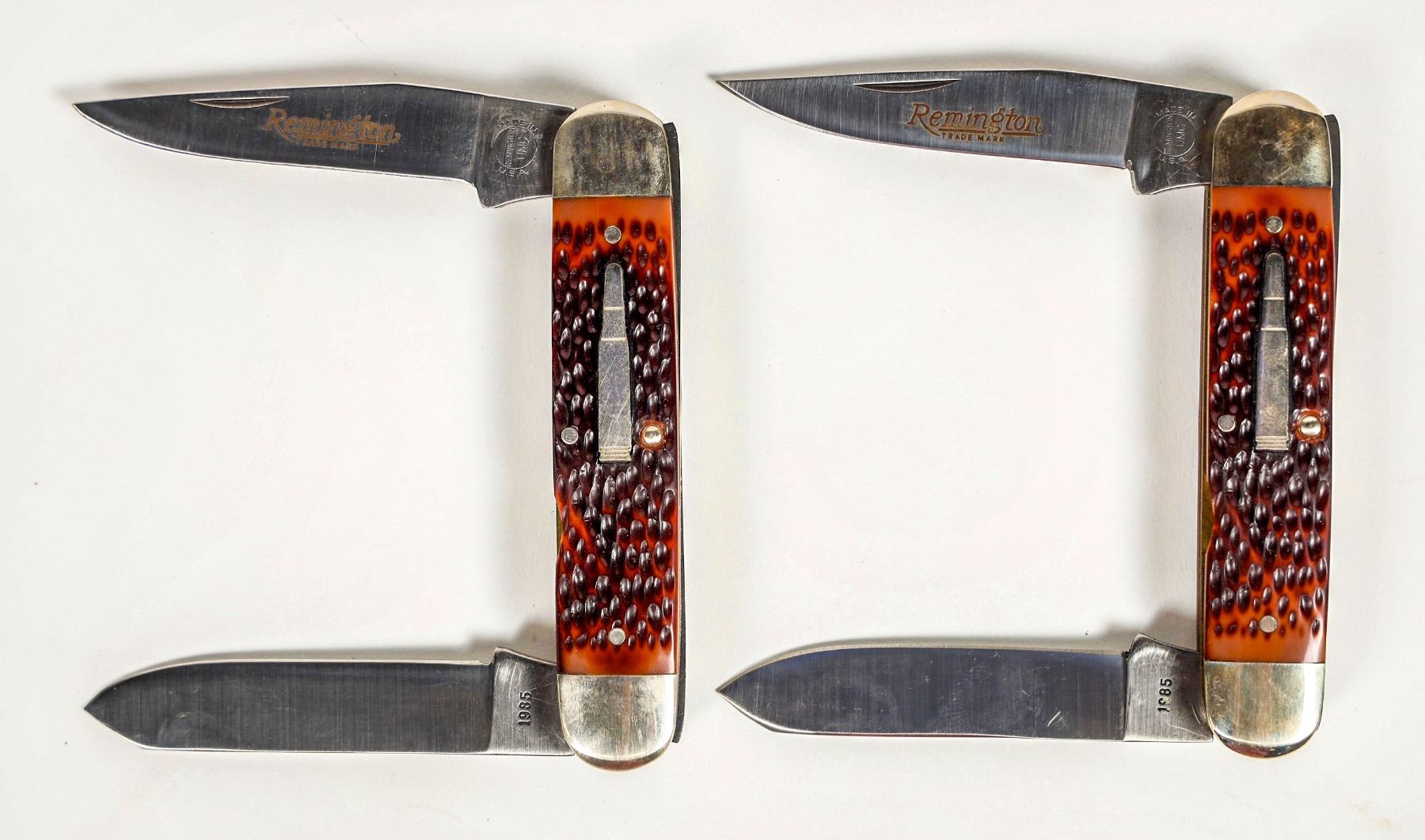 This group has two Remington Woodsman bullet knives model R4353 on delrin scales. New in the box with paperwork. 4. 5 in. closed. 1985 stamped on the blade. Please see photos for details.