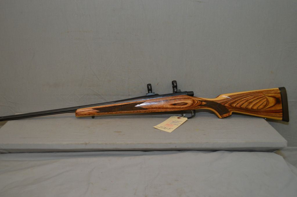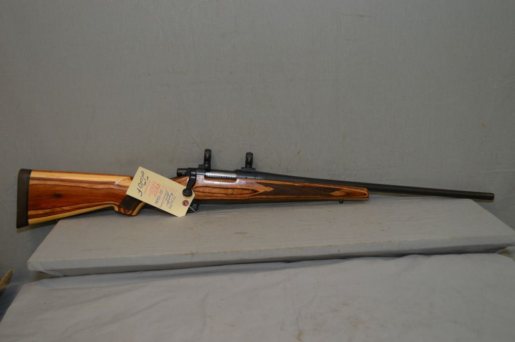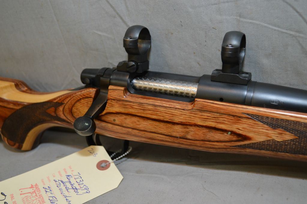 Remington Model Seven .270 Win Short Mag Cal Bolt Action Rifle w/ 22" fluted bbl [ blued finish, no sights, but has rings & bases, laminated checkered pistol grip stock & forend, w/ Remington recoil pad, few slight marks ] Ser # 7830599