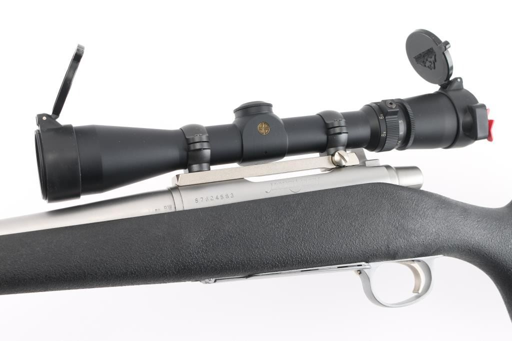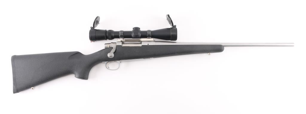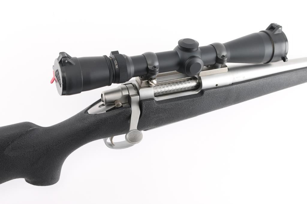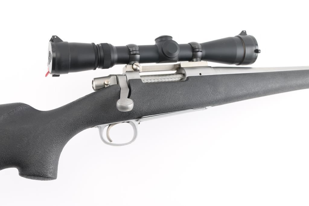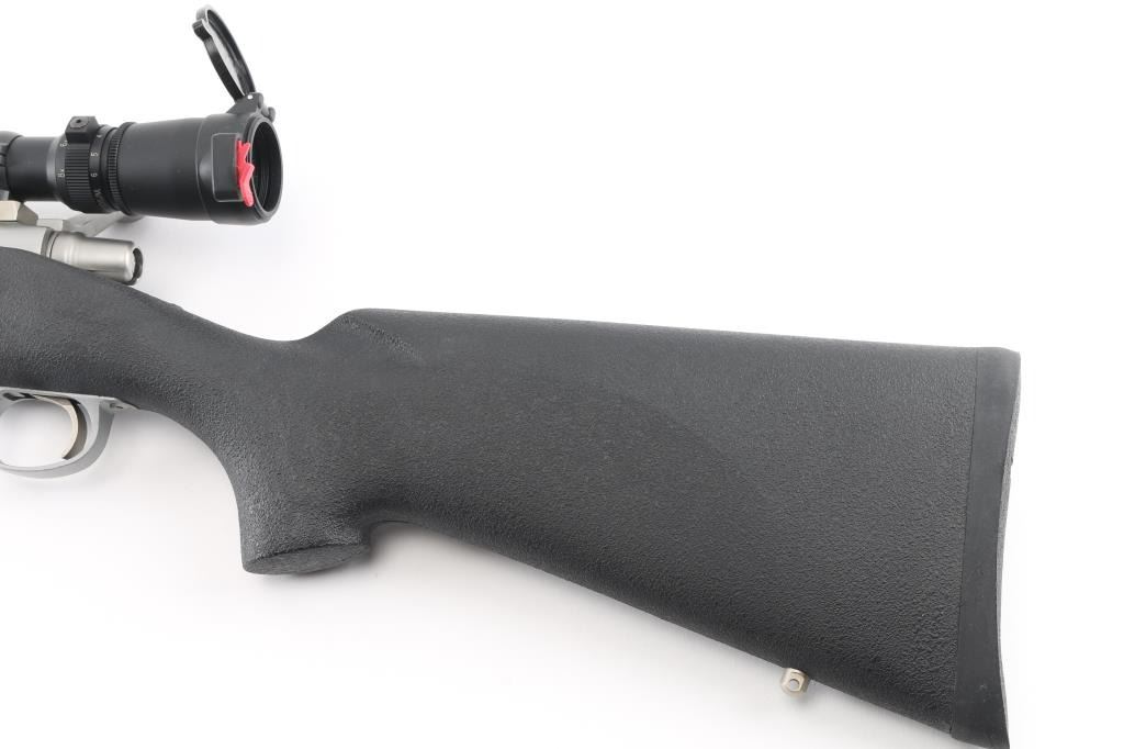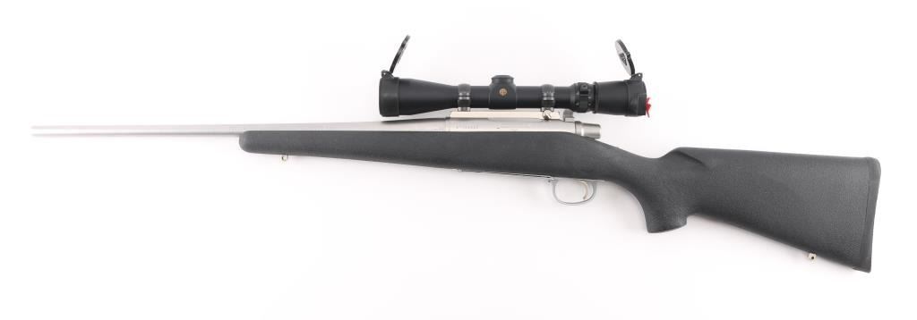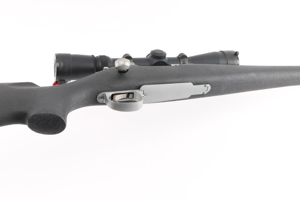 Short action bolt action rifle features stainless steel construction, black polymer stock, no cheekpiece, rubber butt pad, sling studs, 20" barrel, no sights, one piece Leupold base & rings, hinged floorplate, manual safety. Bore is excellent condition. Overall excellent condition with few handling marks. Mounts a very good condition Leupold Vari-X III 2.5-8x scope with clear view. Condition is NRA Excellent *** Modern Firearm ***