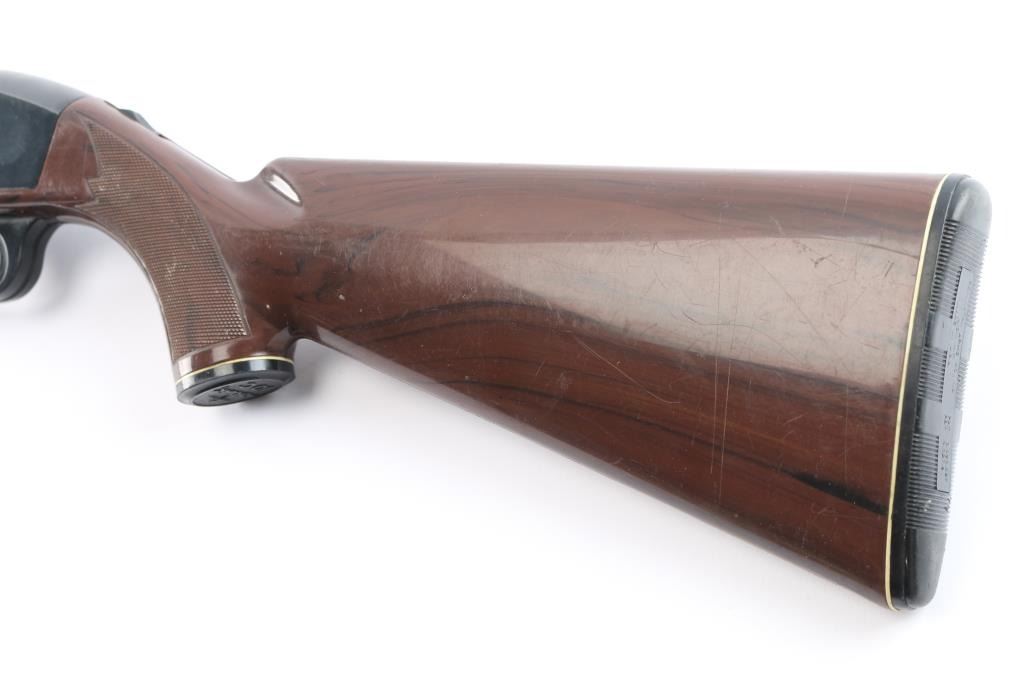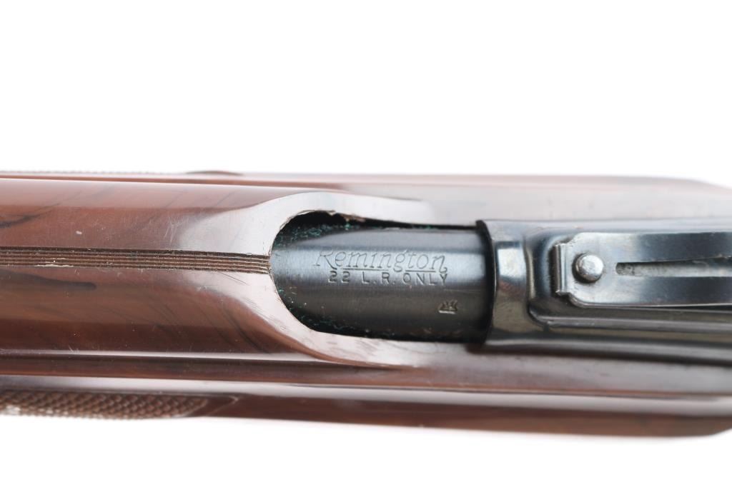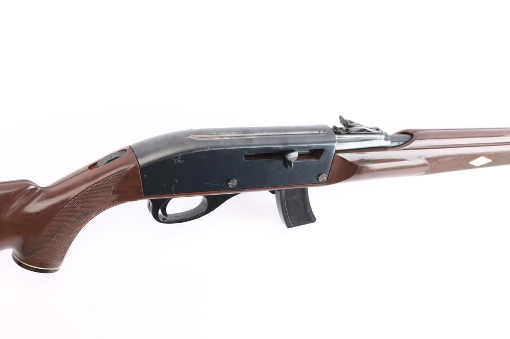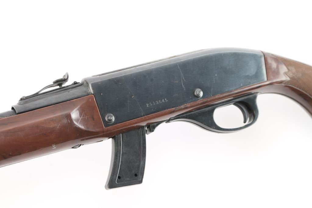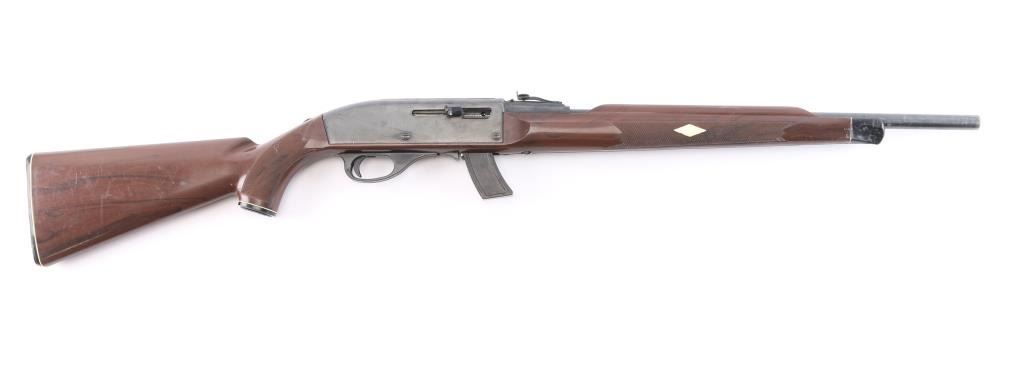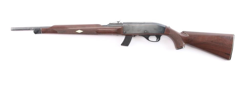 Magazine fed semi-Automatic. "Mohawk" from the Remington 'Nylon' series. Produced 1971-1978. 'PZ' date code, June, 1975. Blued finish, brown polymer stock with white diamond. 19.5" barrel with adjustable rear sight, front sight removed. Receiver grooved for scope mount. Fed from a 10 rd box magazine, (Included). Bore is excellent/bright, action is smooth, stock is overall good/sound with scratches/scuffs and the blue is about 85% with minor scratches with heavy scratches, wear on the upper barrel.