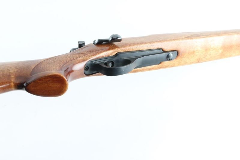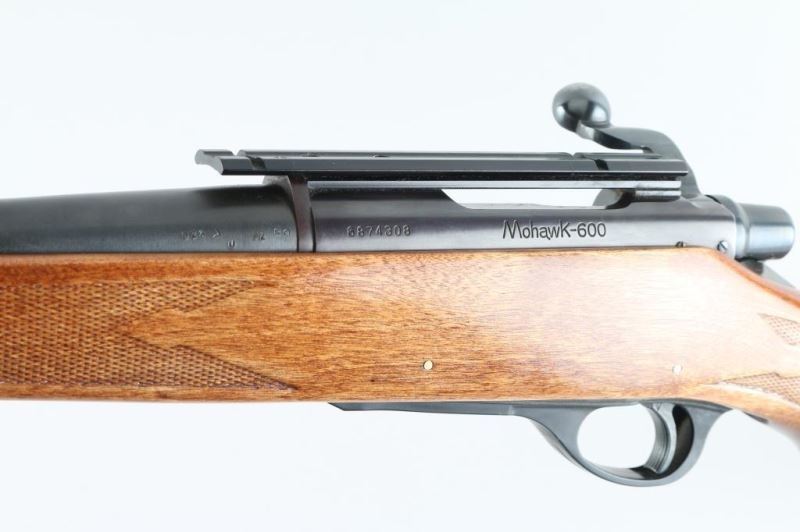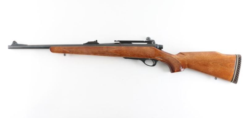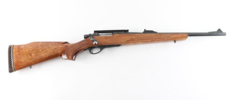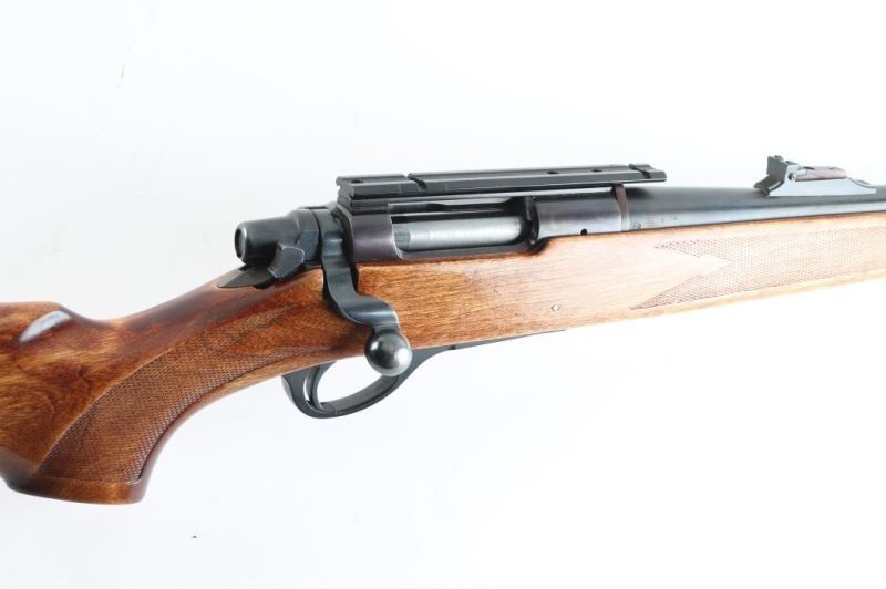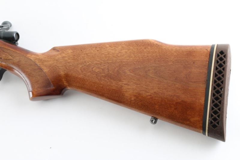 Bolt action rifle features blued finish, wood stock, ventilated rubber recoil pad, impressed checkering at wrist and forend, 18.5" barrel, adjustable sights, single piece scope rail, manual safety, "dogleg" bolt handle, blind magazine. Sling swivel studs. Bore is excellent/bright. Retains 95% finish on blued parts with minor edge wear, and handling loss on the bolt knob. Stock is excellent. NRA Condition-Near Excellent. Modern Firearm.