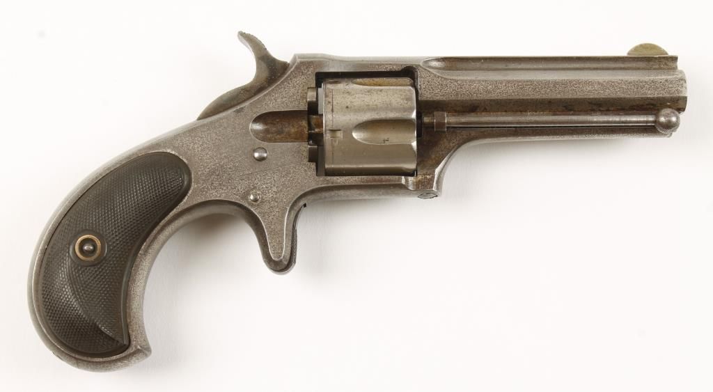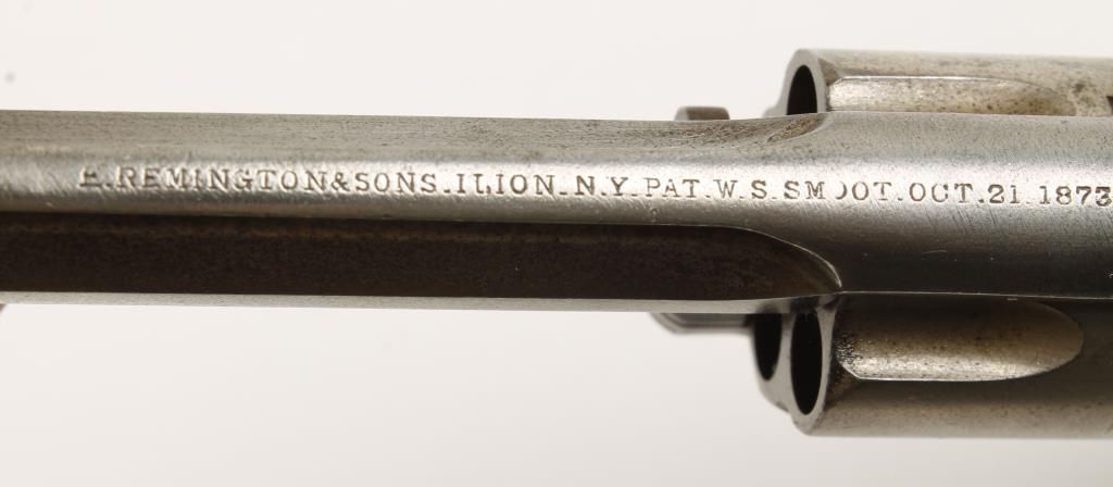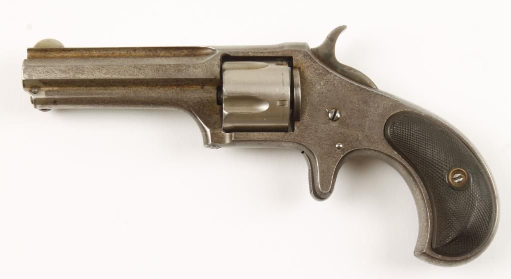Single action 5-shot spur-trigger rimfire revolver. Originally nickel finish, with checkered hard rubber birds head grips, 2-3/4" octagon solid rib barrel, and fixed sights. Barrel rib is marked "E.Remington & Son's, Ilion, NY, Pat. W.S. SMOOT, OCT 21 1873" Action is tight and in very good working order. Condition: Overall very good antique condition with traces of original finish still visible, with sharp edges and lettering, and grips are very good as well. *ANTIQUE FIREARM*