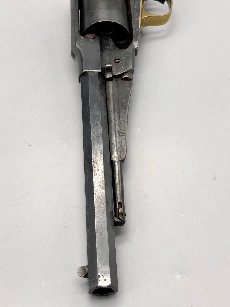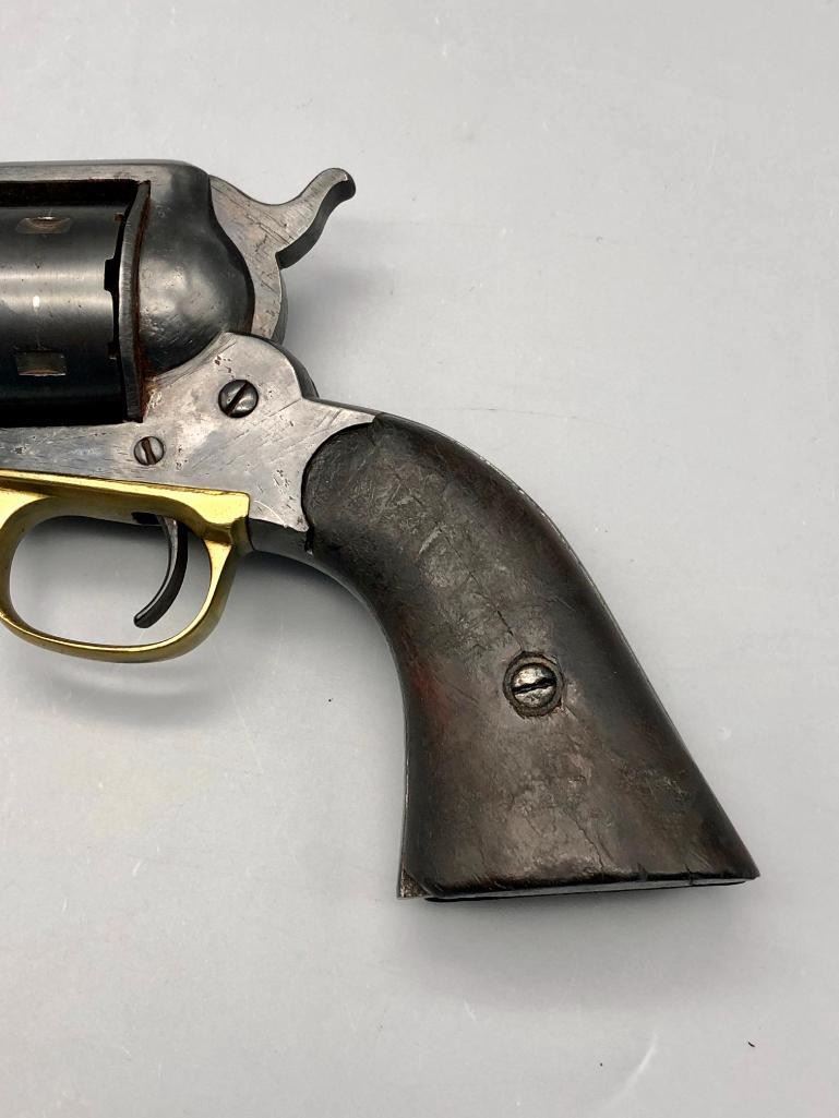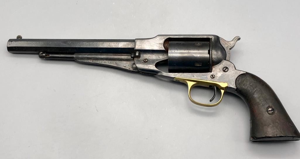 Presented for your bidding pleasure is this antique Remington New Model Army Cartridge Conversion Revolver. It is in refurbished condition, like re-bluing for one. It has minor dings to the metal and original wood grips and a brass trigger guard. It has been converted from percussion to fire center fire cartridges at some point. This revolver cycles, however we have not fired it. Keep in mind this is an antique and not warranted safe to shoot and it should not be attempted without the aid of an expert. MAKER: Remington. APPROX AGE: Antique, C. 1870s. SIZE: .44 Cal. CONDITION: Refurbished. Please look closely at the pictures as they are an important part of our description and are hereby incorporated into the description, specifically with regards to condition. SHIPPING: There will be a $15 handling / packaging fee for shipping this lot. The actual cost of postage will be added on top of that. BUY IT NOW: If you would like to buy this item now, without waiting for the auction day to bid on it, we do offer this option (which is available up to 48 hours before the actual auction starts). The “Buy it Now” price is the high estimate of this lot (plus applicable fees and the Buyer's premium is discounted to 10% when using the Buy it Now option). If you would like to exercise this option, you must contact us by email (or phone as long as you talk to someone live). Reference this lot number and your intention to "Buy it Now." *****ANTIQUE - This firearm DOES NOT REQUIRE an FFL Transfer*****