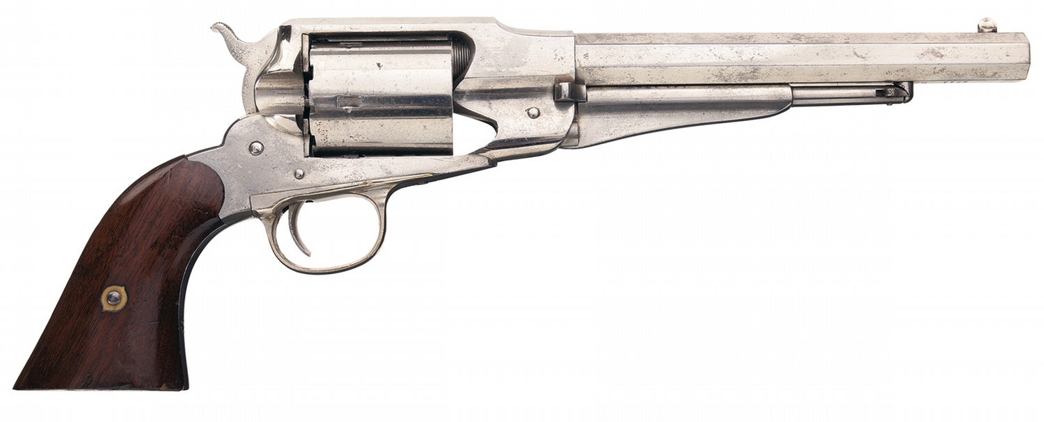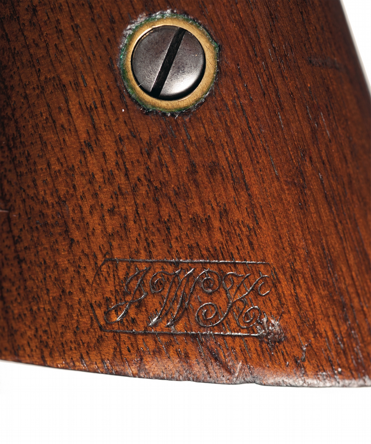 This revolver was subsequently converted to cartridge, post Civil War. Top barrel flat has the patent date, address, and model marking with one letter inspection marks on most of the components and the 1855 patent date on the cylinder. All nickel finish. Serial number (137026) and the number factory conversion "2913" are stamped on the barrel and frame. A "C" is stamped under the barrel which is obscured by the cylinder pin. Fitted with smooth grips stamped with a JWK cartouche on the left panel and the number "2" on the bottom of both panels.