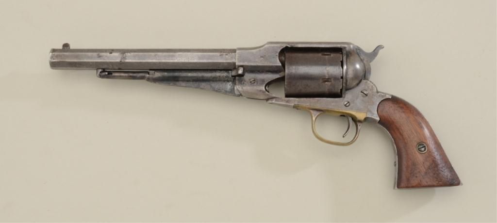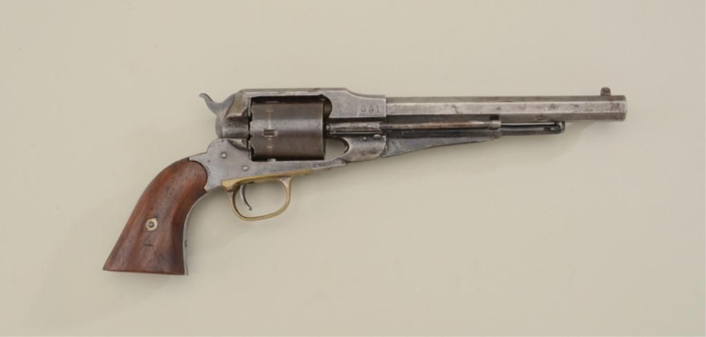 Remington New Model Army Revolver with Rollin -White conversion to 46 cal. rim fire; 5 shot cylinder shows patent dates of April 3, 1855. Pistol is numbered 142638, the pistol remains in good to very good originalcondition showing aprox 30- 40% original drifting blue finish. The right side of the frame is stamped "CA391" The grips have been lightly sanded and are slightly undersized. The barrel address is sharp, action good,bore bright. Original ejector rod and small parts all retained. A key conversion for the evolution of American firemans. Est.; $1,250 - $2,500