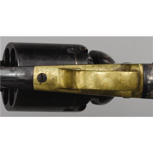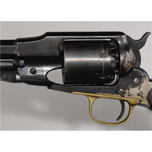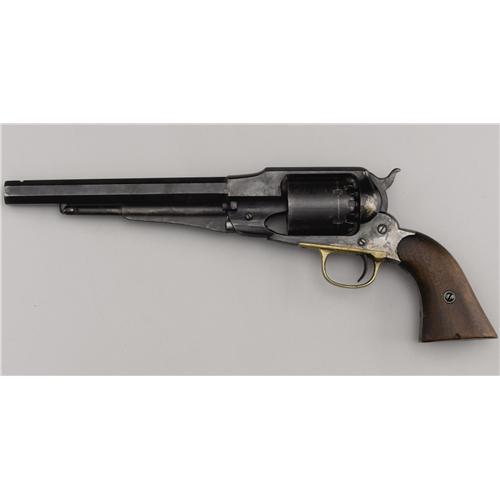 <B>Remington New Model Army</B></I> .44 caliber, six shot cylinder, serial number 28741. Remington New Model Army revolvers were produced from 1863 to 1875 and proved very popular with the Ordinance Department as they were cheaper than the comparable Colt pistol. Overall, some 115,557 New Model Army revolvers would be procured by war's end, just slightly fewer than the 127,157 Colt M1860 revolvers bought over the same period. This particular pistol bears an 8 inch octagonal barrel and is marked, "PATENTED SEPT. 14, 1858 / E. REMINGTON & SONS, ILION, NEW YORK, U.S.A. / NEW - MODEL" on the top of the barrel. Serial numbers are noted on the left side of the frame under the grips and on the bottom of the barrel above the loading lever. The last four digits appear to be stamped on the back of the cylinder, but they are mostly illegible. Other markings include a "W" on the left side of the loading lever, a "W" on the left frame just behind the recoil shield and a "P" on the trigger guard just behind the front screw. Mechanically very good, this pistol was refinished, probably in the 1960s, with bluing remaining on all steel parts except the rear of the frame, front strap and back strap. The front sight is missing, probably from the aforementioned refinishing. The trigger guard exhibits a nice yellow patina, and the grips are relatively mark free although a chip on the lower left panel is noted for accuracy.<BR><BR><b>Shipping:</b> Large Collectibles (<a target="_blank" href="http://www.heritageauctions.com/common/shipping.php">view shipping information</a>)