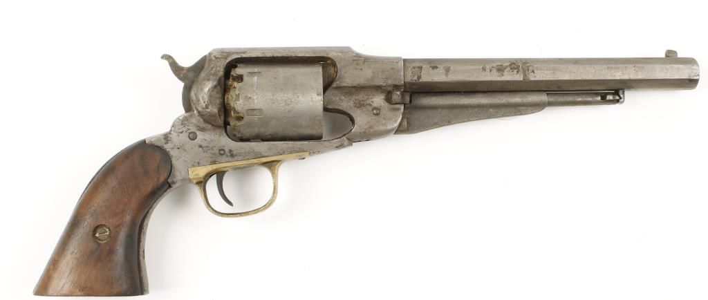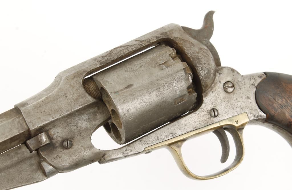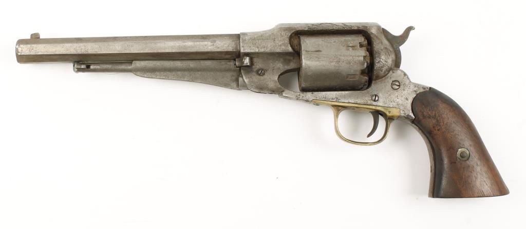 Civil War era percussion revolver. In original configuration with smooth wood grips. In relic condition. Barrel marking visible.