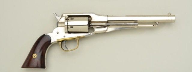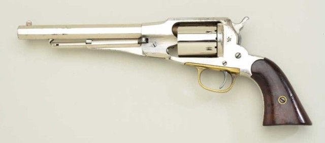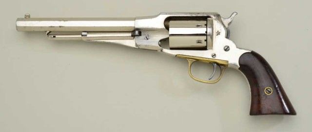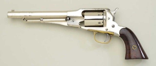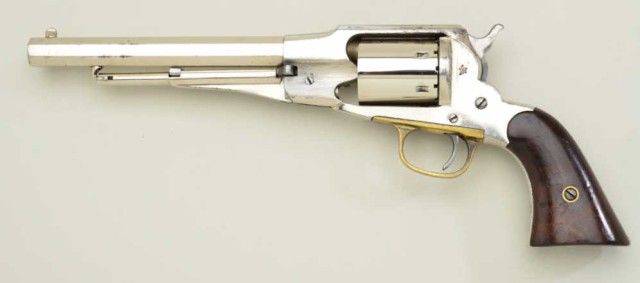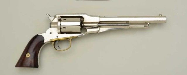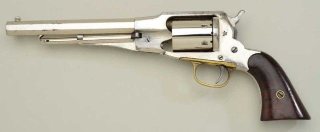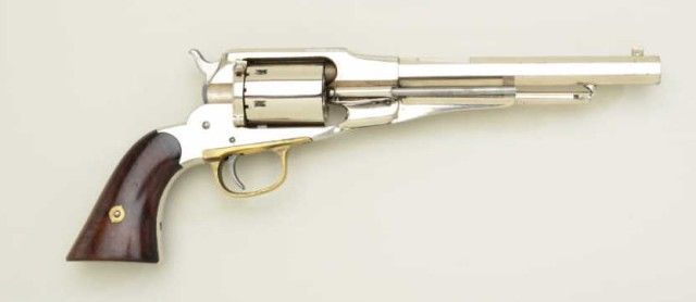 Remington New Model Navy factory conversion to 38 long rim fire, serial #41449 and conversion #464. The Remington shows 90-95% original nickel except cylinder which has been expertly re-nickeled. There is someareas of pitting most notably on the edge of the frame and recoil shield area. The grips are very good plus, the markings good, action good, bore very good. An exceptional Navy conversion with a bit of restoration.Est.;$900-$1,800.