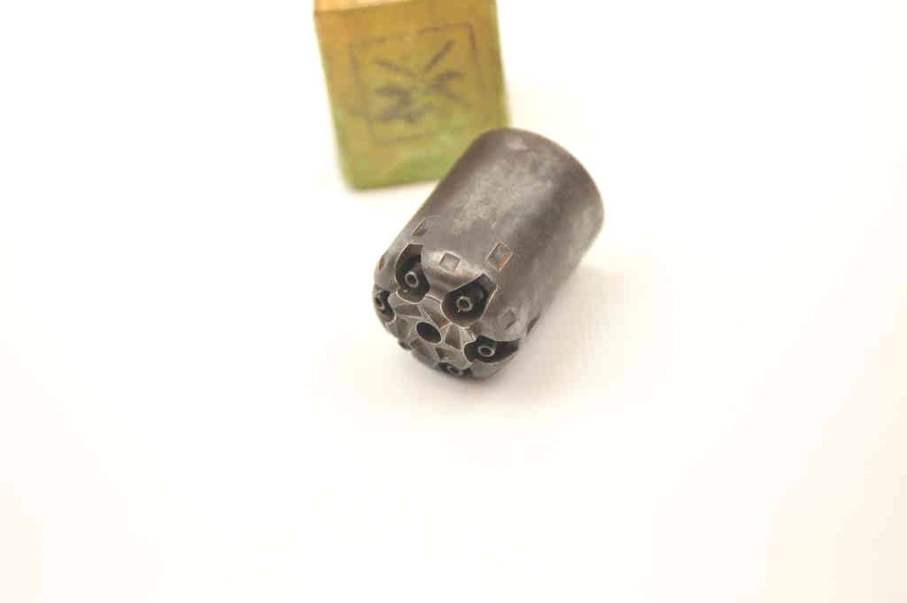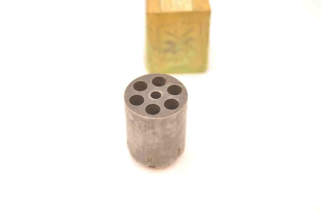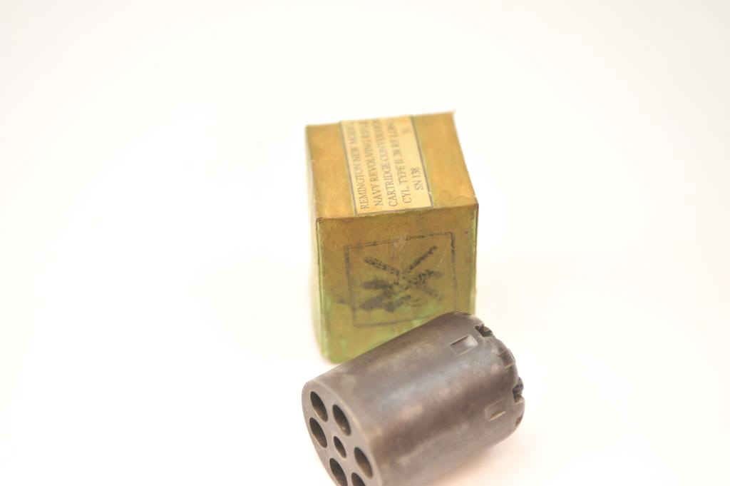 Remington New Model Navy revolving percussion rifle cylinder in .36 caliber in the factory cardboard box. The cylinder has gone to a dark mottled patina with areas of light surface erosion. Hard to find in thiscondition. Est.: $150-$300.