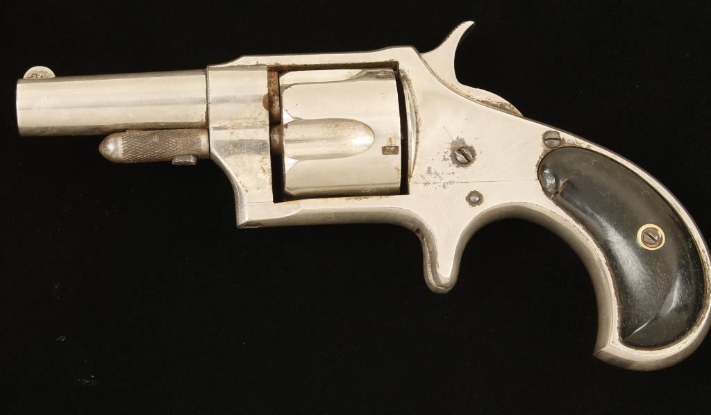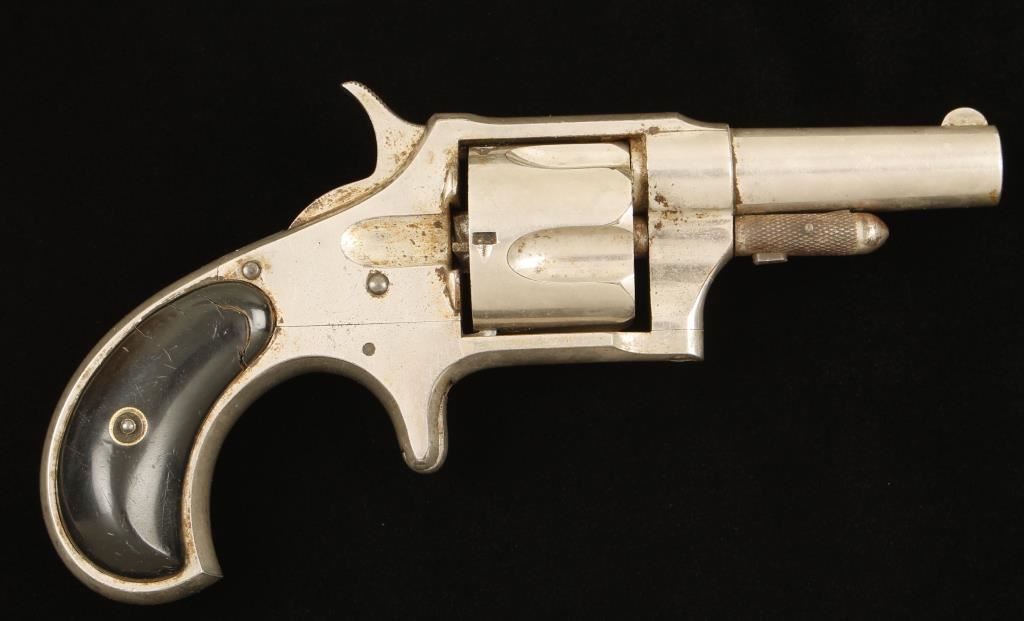 Nickel plated single-action spur trigger 5-shot rimfire revolver with a 2-1/2" barrel and black celluloid grips. Plating is over 90% intact but is dull with wear and scratches. The remaining 10% has surface rust. Bore is dull with sharp rifling and surface rust or pitting. Chambers are dull with some surface rust. Action is good with very good lock-up. Grips are scratched, worn and cracked. Condition is good to very good. *Antique Firearm*