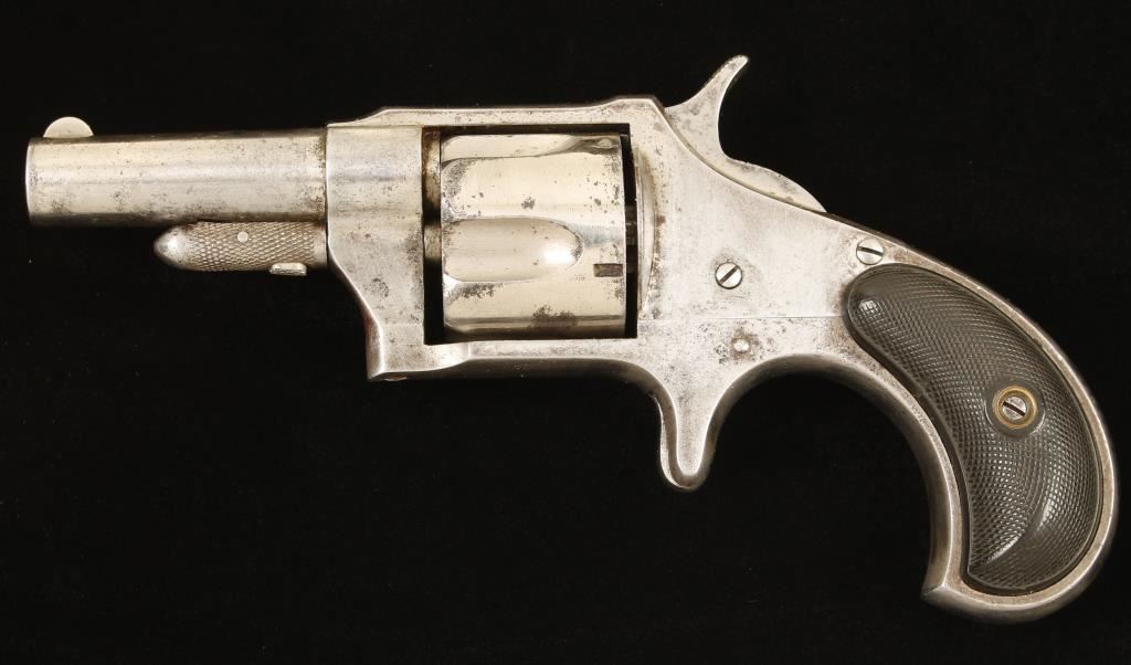 Nickel plated single-action spur trigger 5-shot revolver with a 2-1/2" barrel and hard rubber grips. Plating seems to have gone over much of the frame and barrel giving way to pin-prick pitting and rust stains. Cylinder retains maybe 80+% of plating. Bore is shiny with sharp rifling and a little pitting. Chambers are shiny. Action is very good with very good lock-up. Grips are intact with little wear. Condition is good. *Antique Firearm*