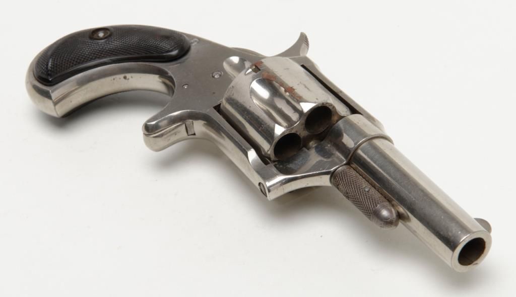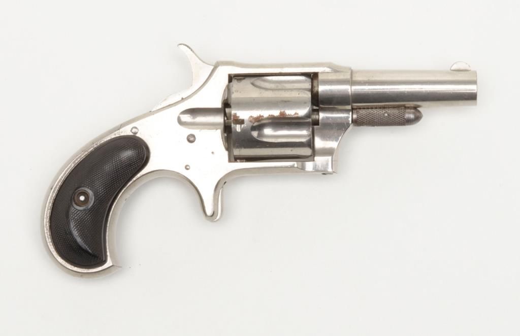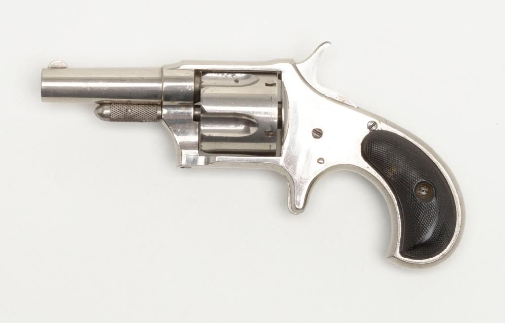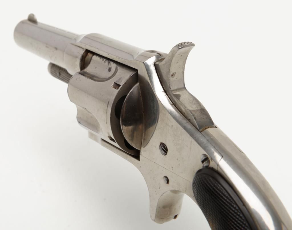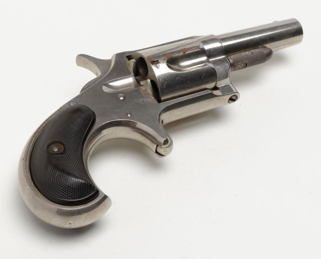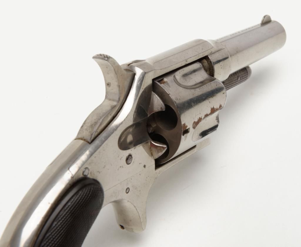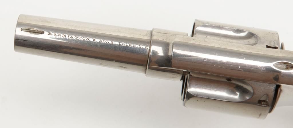 Remington New Model No. 4 revolver, .38 cal., 2-1/2” round barrel, nickel finish, checkered hard rubber grips, #NVSN in overall very good to fine condition showing the majority of its original finish, crisp action, sharp markings, very goodbore and grips; accompanied by a two piece cardboard box with copy of Directions on inside of lid. (Antique). Est.: $350-$700.