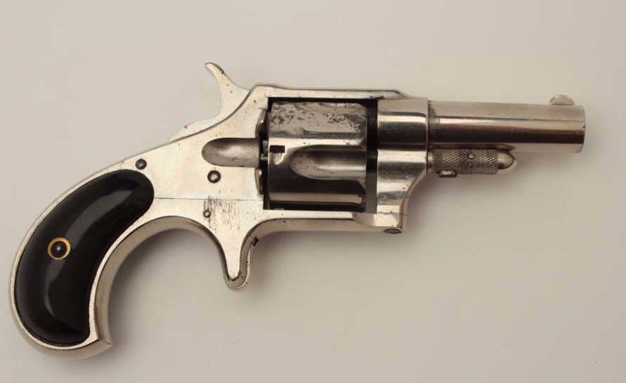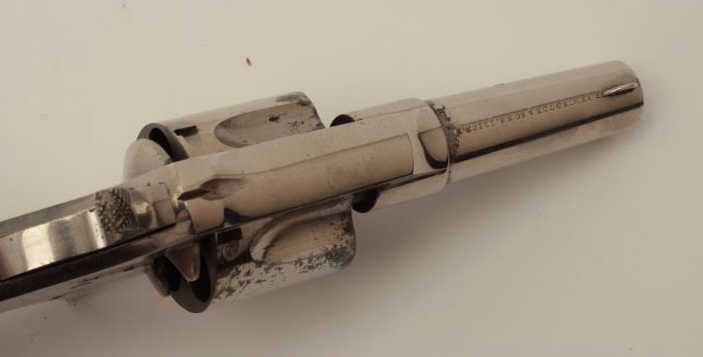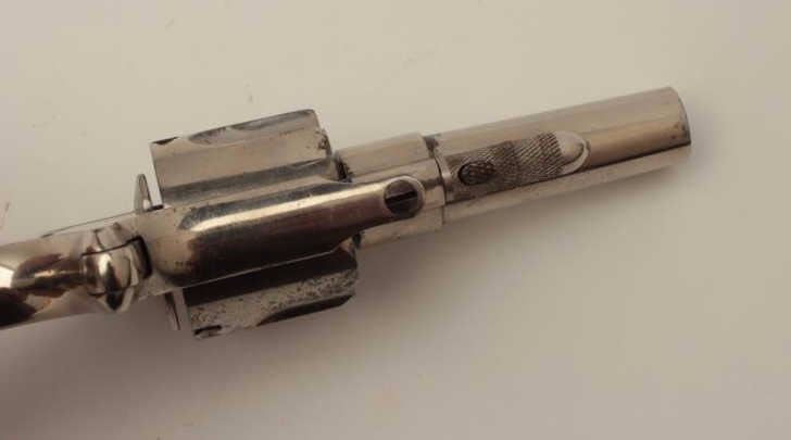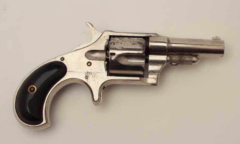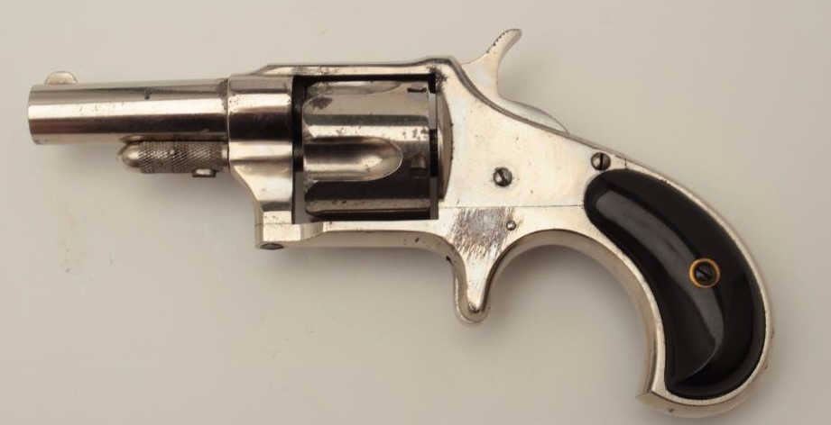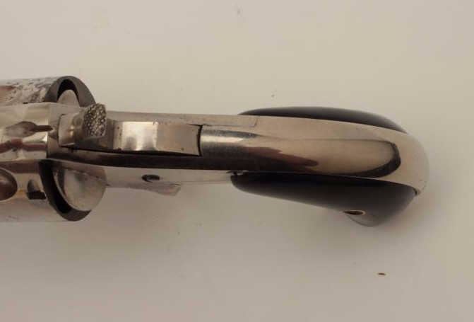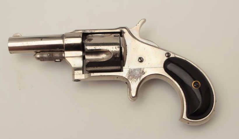 Remington New Model No. 4 revolver, scarce in .41 short caliber, 2.5” round barrel, nickel finish, wood grips, no visible S/N, in overall very good to near fine displaying the majority of its original finish, crispaction, sharp markings and fine grips. (Antique). Est.: $300-$600.