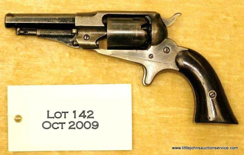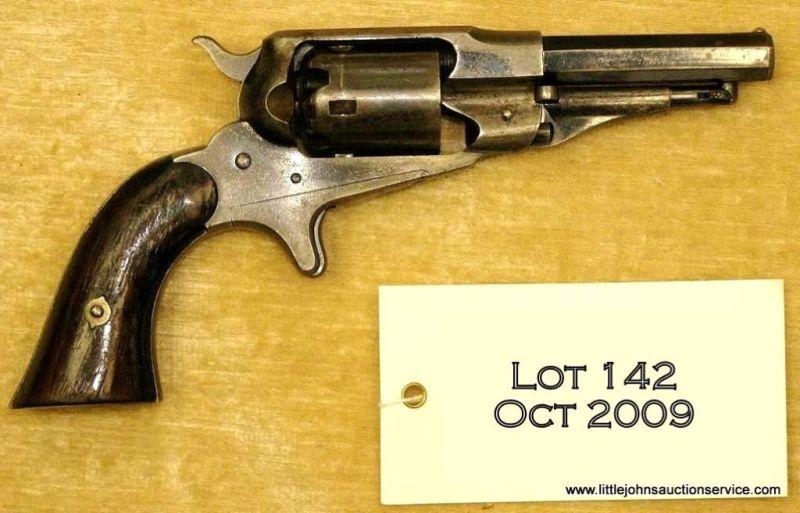 Remington New Model Pocket spur trigger percussion revolver, .31 cal., 3-1/4” barrel appears slightly shortened or crowned, blue finish, smooth wood grips, #15482. This gun, rare in blue, is in overall very good + condition showing approx. 80% original blue on the barrel, loading lever and cylinder, and approx. 20% original blue on the frame; very good bore, action, markings and grips. Est.: $500-$1,000.