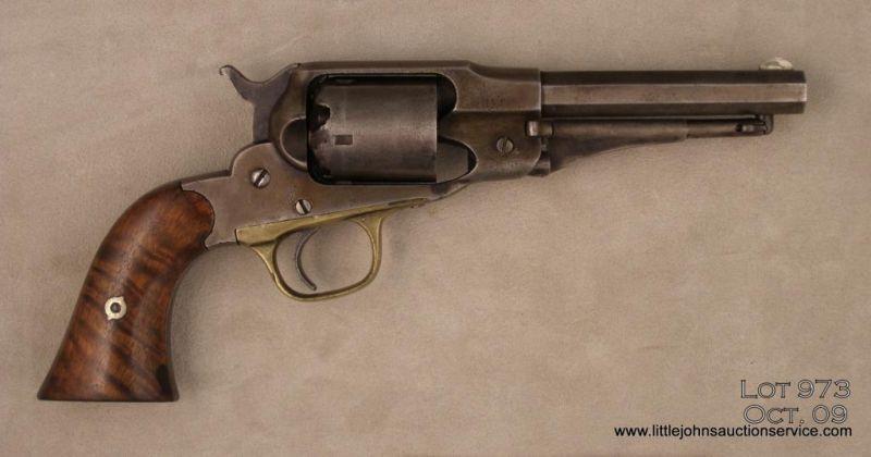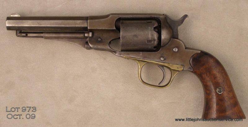 Remington New Model Police Revolver in .36 cal percussion. Blued finish, walnut grips, 4.5” octagon barrel. Finish has drifted to a nice patina; grips are very good to fine cond. showing no chips or cracks. Nice bore. Good condition.Est. $400-$800.