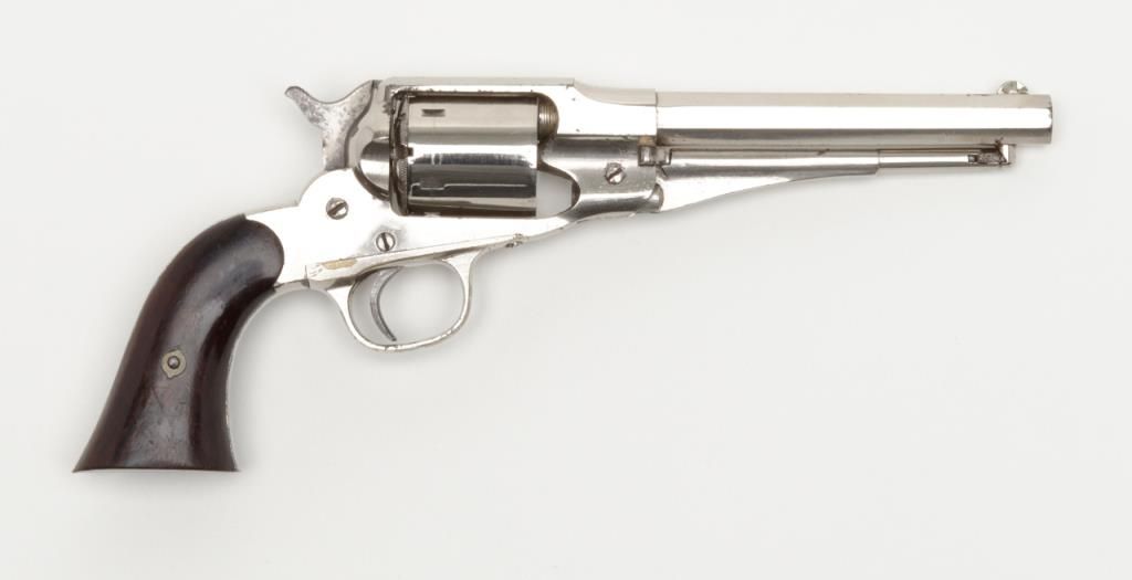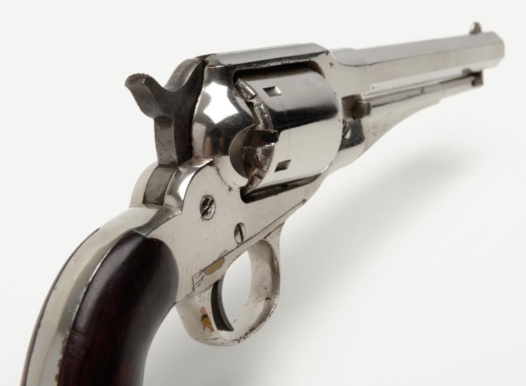 Remington New Model Police conversion to .38RF cal., 5-1/2” barrel, nickel plated finish, varnished wood grips, #14600. The revolver remains in fine to near excellent condition showing 90%-95% original nickel, some minor losses; areaswhere finish has lifted show a dark patina. The trigger and hammer show considerable original case colors, the grips show approx. 70% varnish, slight wear at the edges. The interior is crisp, the bore excellent; an 8.5 to 9 on a scale of 1 to 10. (Antique). Est.: $1,000-$1,800.