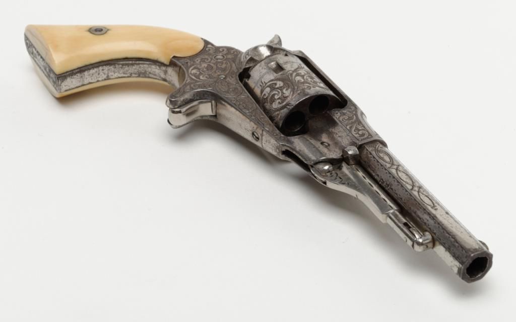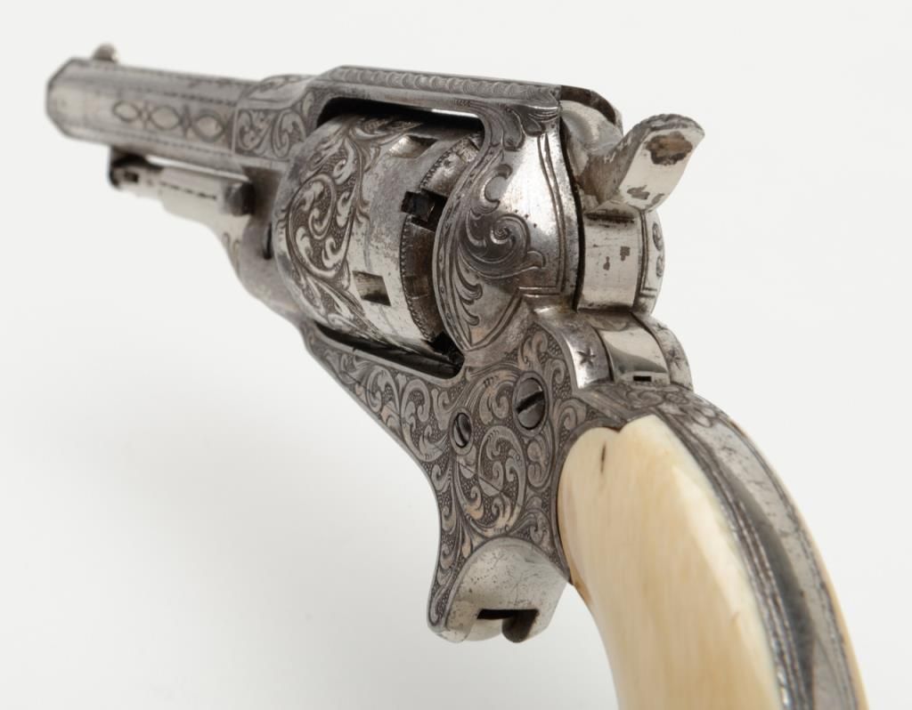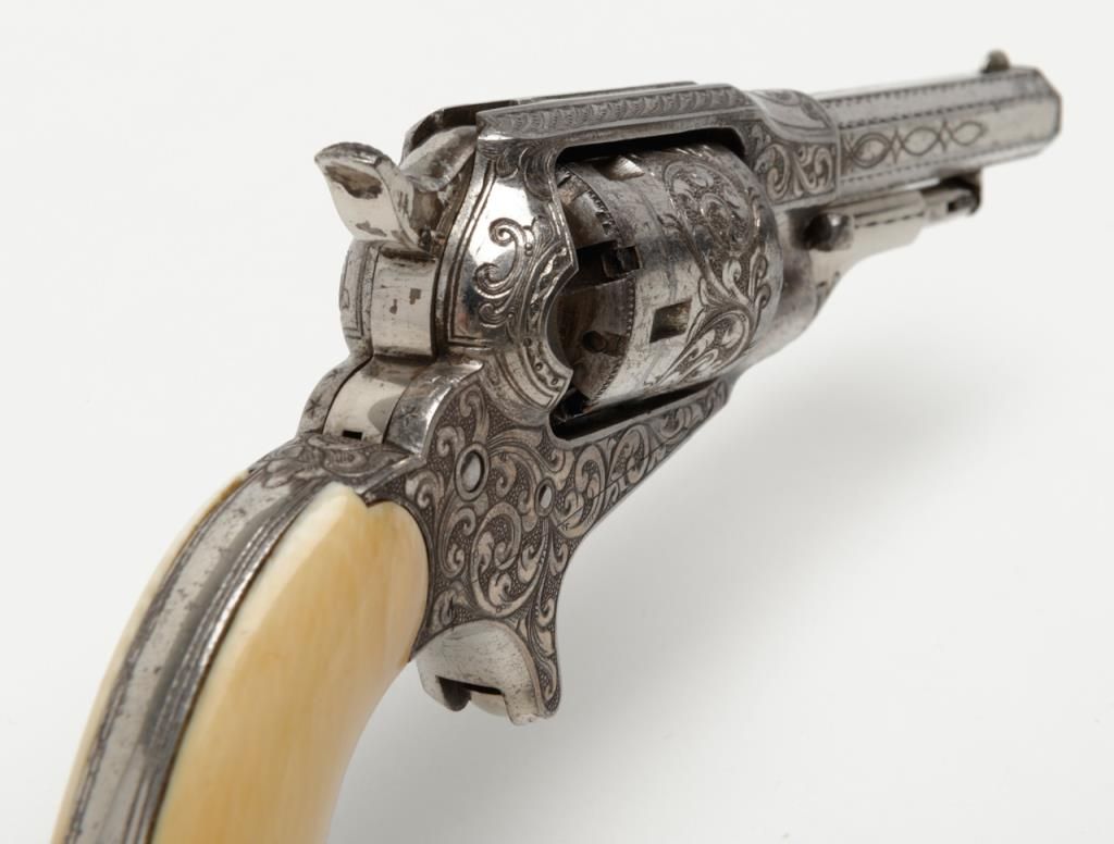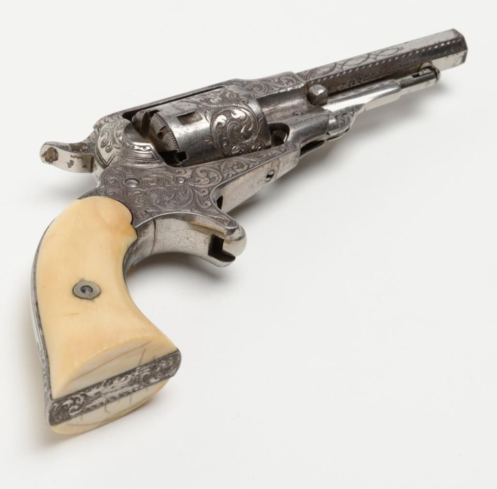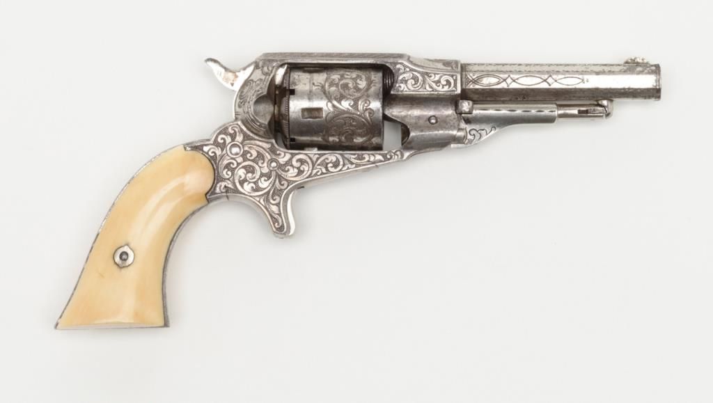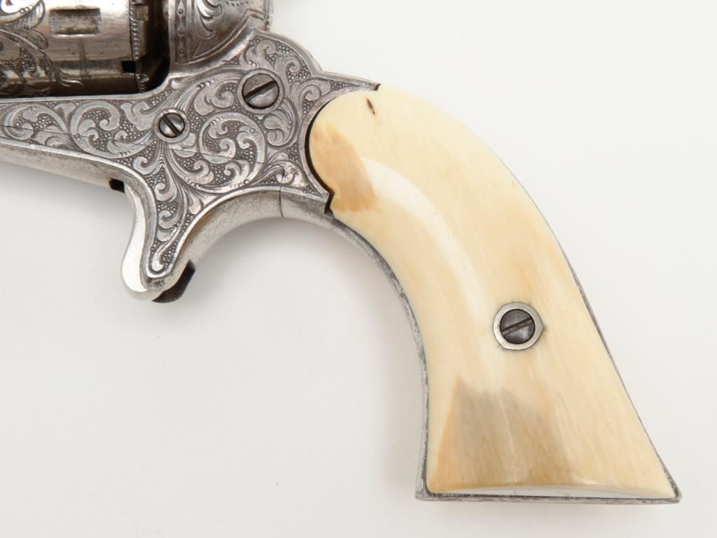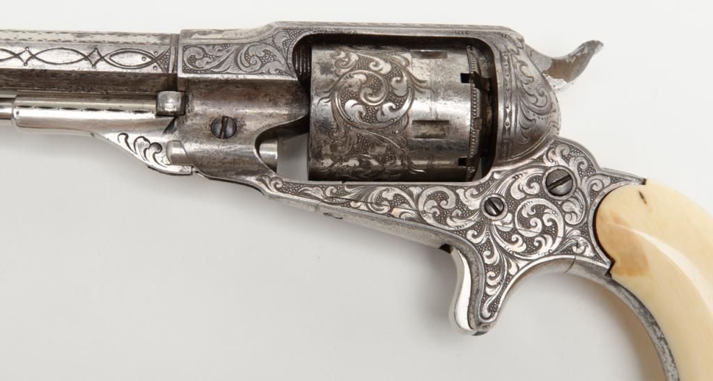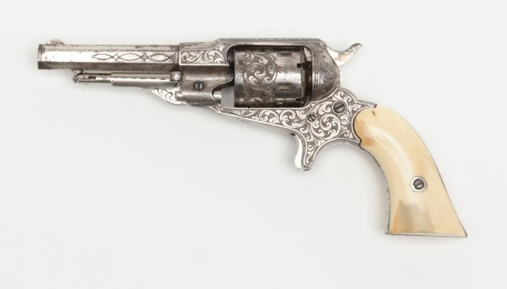 Remington New Model pocket revolver, converted from percussion to .32 RF cal., full and finely New York style scroll engraved, probably by L.D. Nimschke. The revolver shows 75%-85% original silver that is un-cleaned and unpolished andnaturally aging where the finish has lifted. There is some minor erosion and beginning aging. The ivory grips are genuine to-the-period and fit perfectly with a mellow patina. The markings are sharp, the action is crisp, condition is at leastvery good overall. The engraving is of exceptional quality and shows fine scrolls, geometrics and characteristic star accents on rear of frame. (Antique). Est.: $3,200-$4,200.