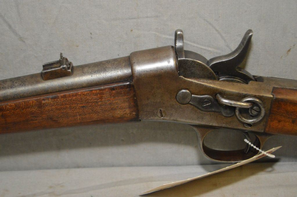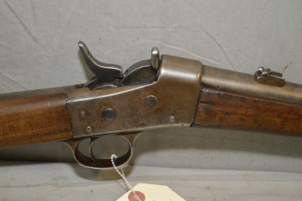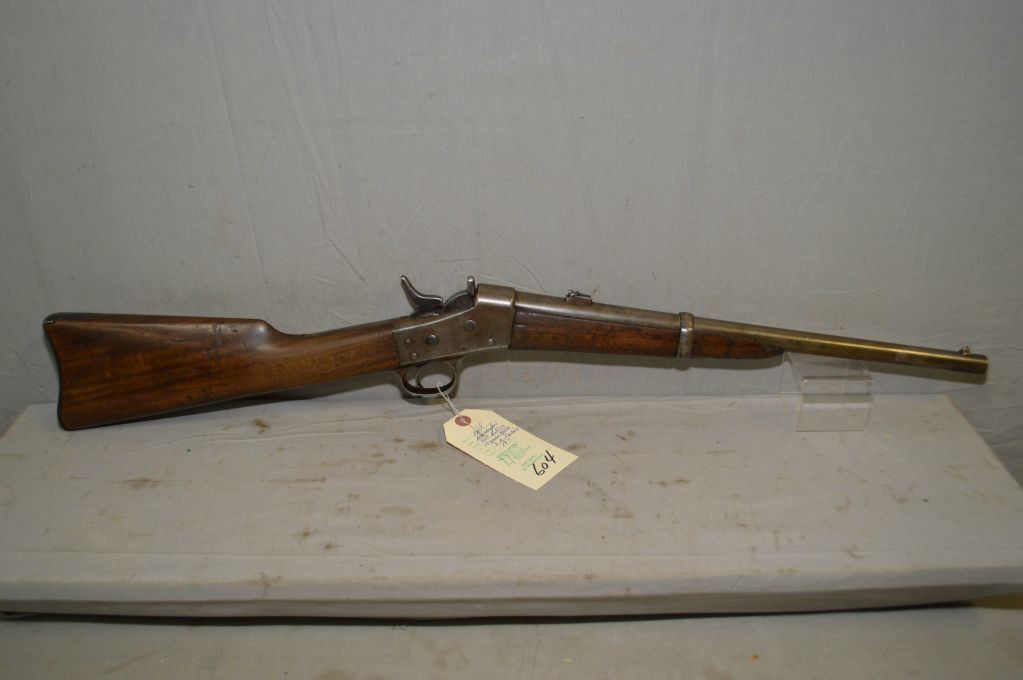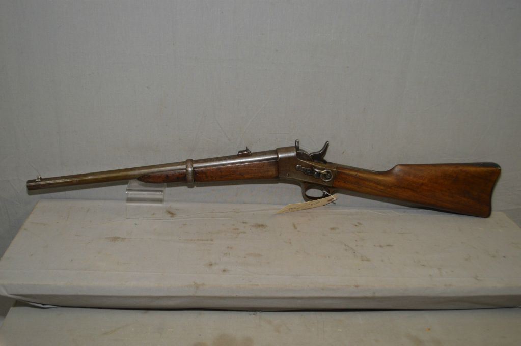 Remington No. 1 Rolling Block .43 Spanish Cal Saddle Ring Carbine w/ 19" bbl [ faded blue finish, turned brown, traces of flaking case color on receiver turned silver, barrel sights, some marks to wood and small chips to forewood, wood insert repair behind trigger guard, front band stamped with a U, Remington Three Line Address on upper tang, barely visible ] Ser # Nil ANTIQUE NO PAL REQ
