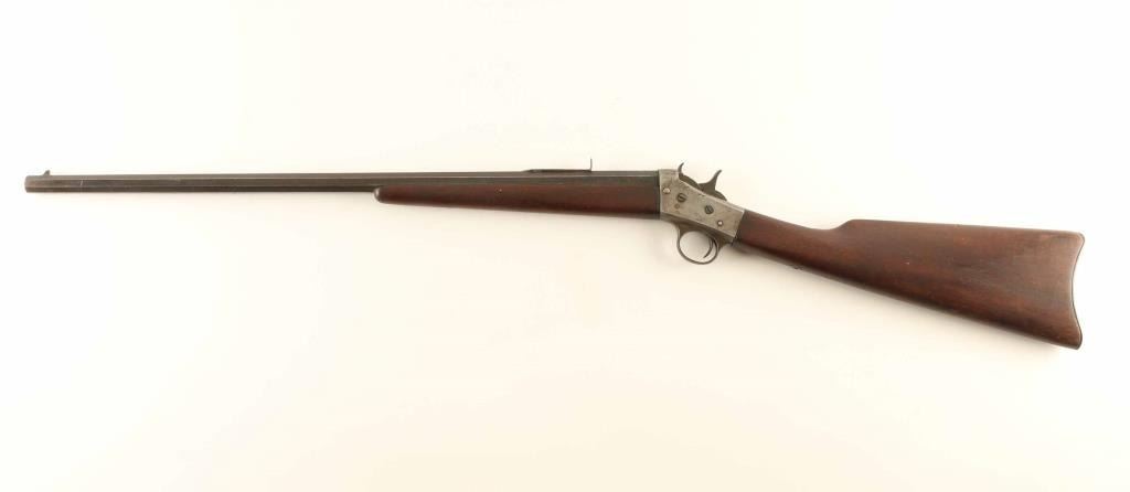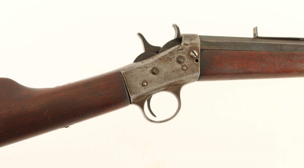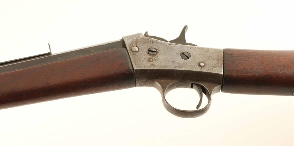 Single shot rimfire rifle features 22" octagonal barrel, buckhorn style sights (rear sight is missing the elevator), exposed hammer, curved metal buttplate. Bore is poor to fair condition, frosted and eroded, with some visible rifling remaining. Barrel retains 60% blue, turning brown, with thinning or bare metal at edges of flats. Receiver has mostly gray coloration, with some aged patina and many small impact dents. Wood is good condition, with scrapes and dents. Markings on barrel are faint but readable. Condition is NRA Good *** C&R Firearm ***