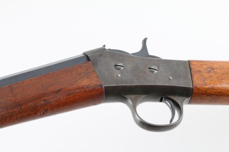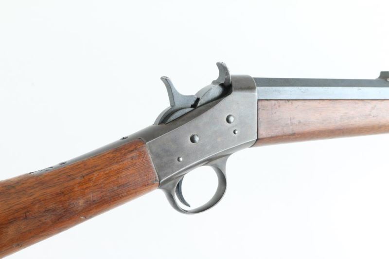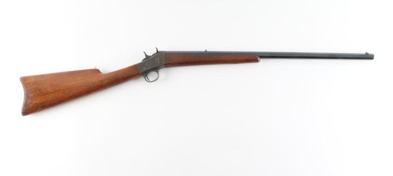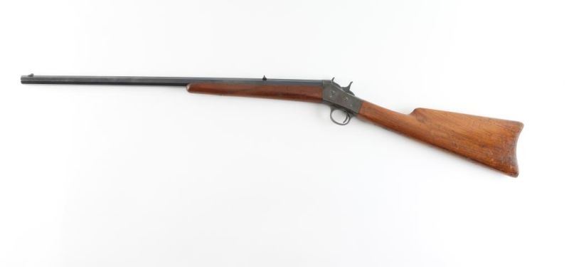 SN: 74426 Single shot rifle features 22" octagon barrel, blade front & drift adjustable rear sights, smooth wood forend, straight gripped wood stock with curved steel buttplate. Bore appears fair condition, dark & pitted, might improve with cleaning. Barrel retains 70% blue, turning a bit brown, with edge losses and scuffs. Receiver is graying brown color, smooth texture & even color. Markings are generally crisp. Wood is good condition, varnished, with many small dents throughout, good fit to metal. Condition is NRA Good+ *** C&R Firearm ***